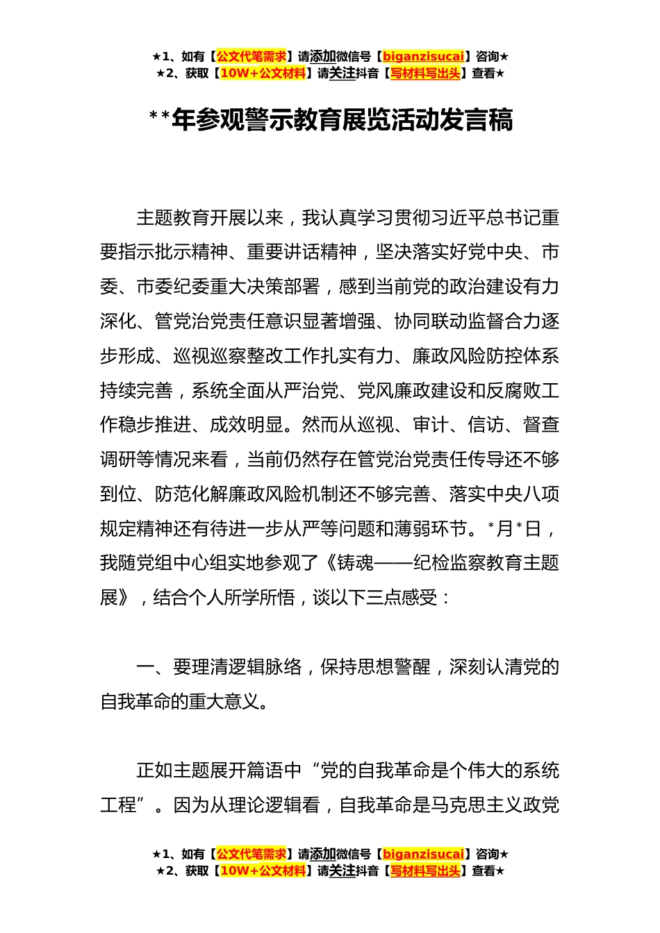 ★1、如有【公文代笔需求】请添加微信号【biganzisucai】咨询★★2、获取【10W+公文材料】请关注抖音【写材料写出头】查看★**年参观警示教育展览活动发言稿主题教育开展以来,我认真学习贯彻习近平总书记重要指示批示精神、重要讲话精神,坚决落实好党中央、市委、市委纪委重大决策部署,感到当前党的政治建设有力深化、管党治党责任意识显著增强、协同联动监督合力逐步形成、巡视巡察整改工作扎实有力、廉政风险防控体系持续完善,系统全面从严治党、党风廉政建设和反腐败工作稳步推进、成效明显。然而从巡视、审计、信访、督查调研等情况来看,当前仍然存在管党治党责任传导还不够到位、防范化解廉政风险机制还不够完善、落实中央八项规定精神还有待进一步从严等问题和薄弱环节。*月*日,我随党组中心组实地参...