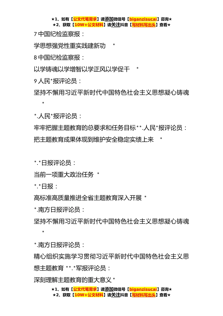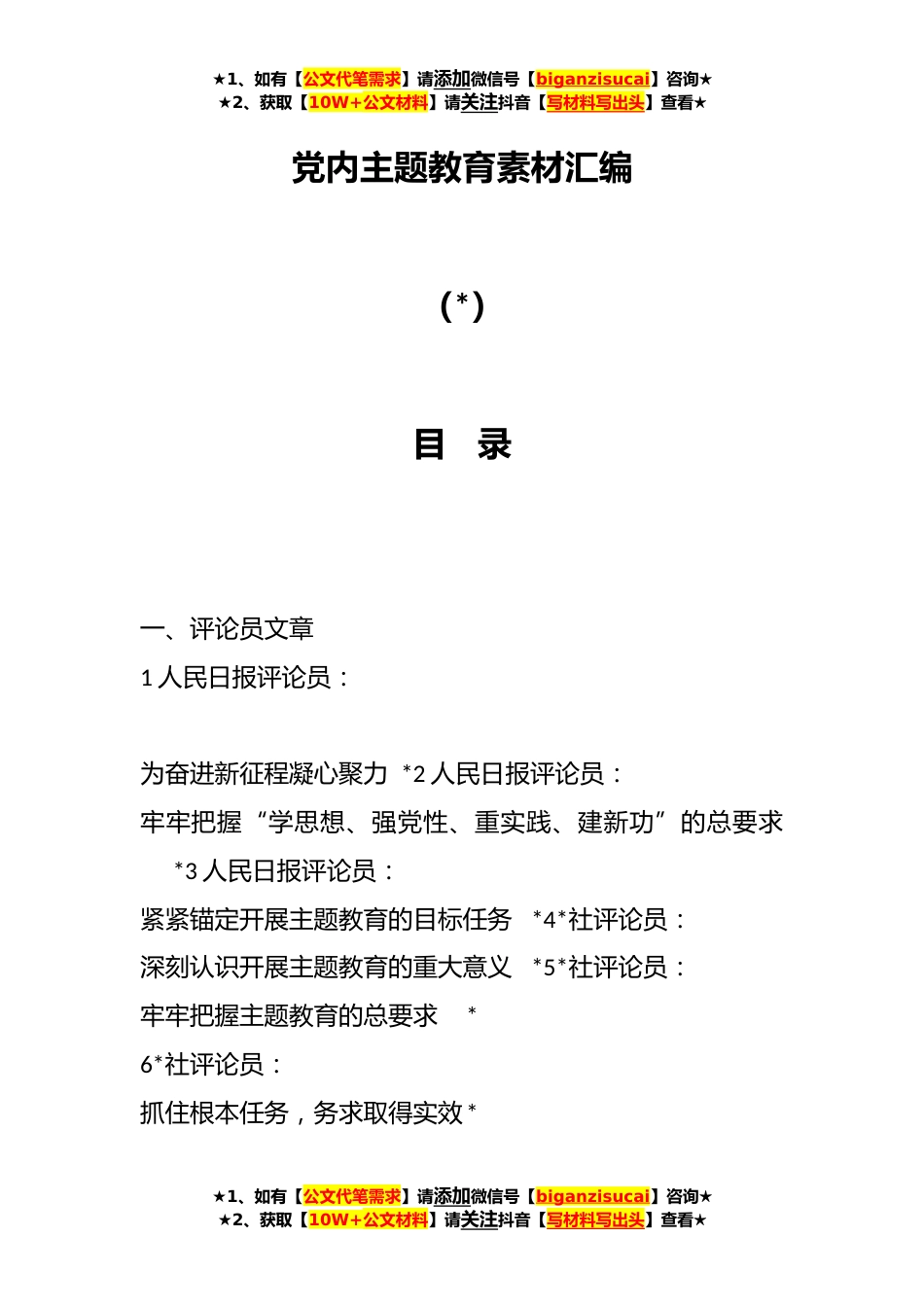 ★1、如有【公文代笔需求】请添加微信号【biganzisucai】咨询★★2、获取【10W+公文材料】请关注抖音【写材料写出头】查看★党内主题教育素材汇编(*)目录一、评论员文章1人民日报评论员:为奋进新征程凝心聚力*2人民日报评论员:牢牢把握“学思想、强党性、重实践、建新功”的总要求*3人民日报评论员:紧紧锚定开展主题教育的目标任务*4*社评论员:深刻认识开展主题教育的重大意义*5*社评论员:牢牢把握主题教育的总要求*6*社评论员:抓住根本任务,务求取得实效*★1、如有【公文代笔需求】请添加微信号【biganzisucai】咨询★★2、获取【10W+公文材料】请关注抖音【写材料写出头】查看★★1、如有【公文代笔需求】请添加微信号【biganzisucai】咨询★★2、获取【10W+公文材料】请关注抖音【写材料写出头】查看...