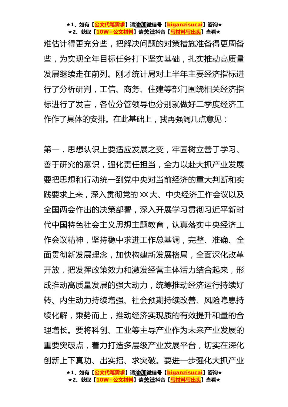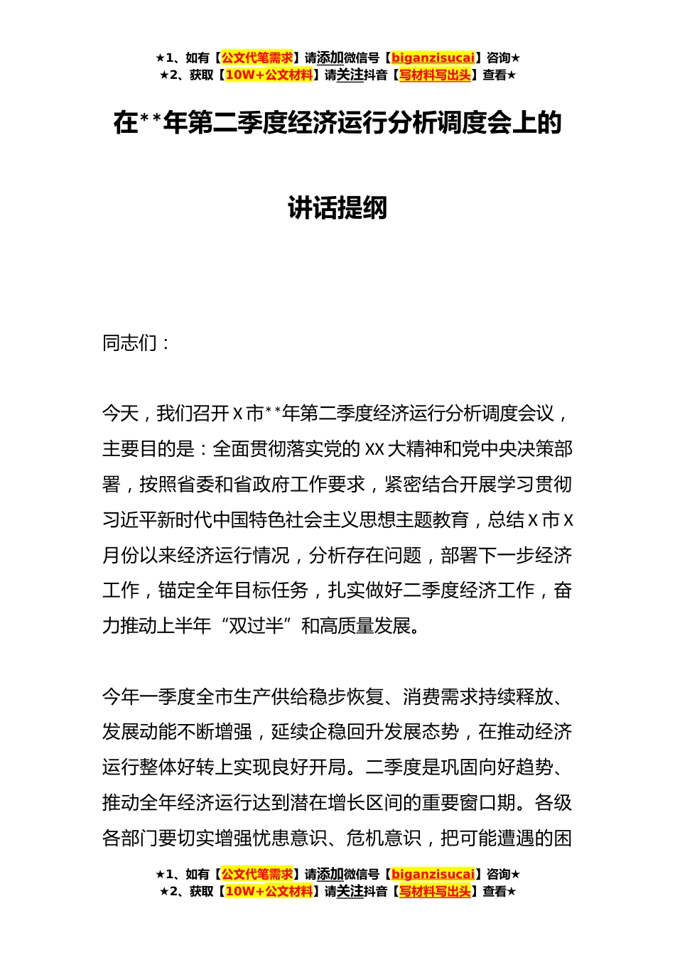 ★1、如有【公文代笔需求】请添加微信号【biganzisucai】咨询★★2、获取【10W+公文材料】请关注抖音【写材料写出头】查看★在**年第二季度经济运行分析调度会上的讲话提纲同志们:今天,我们召开X市**年第二季度经济运行分析调度会议,主要目的是:全面贯彻落实党的XX大精神和党中央决策部署,按照省委和省政府工作要求,紧密结合开展学习贯彻习近平新时代中国特色社会主义思想主题教育,总结X市X月份以来经济运行情况,分析存在问题,部署下一步经济工作,锚定全年目标任务,扎实做好二季度经济工作,奋力推动上半年“双过半”和高质量发展。今年一季度全市生产供给稳步恢复、消费需求持续释放、发展动能不断增强,延续企稳回升发展态势,在推动经济运行整体好转上实现良好开局。二季度是巩固向好趋势、推动全年...