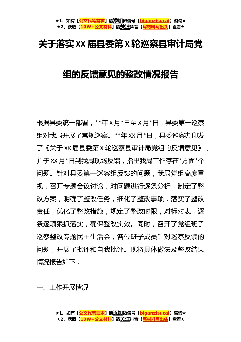 ★1、如有【公文代笔需求】请添加微信号【biganzisucai】咨询★★2、获取【10W+公文材料】请关注抖音【写材料写出头】查看★关于落实XX届县委第X轮巡察县审计局党组的反馈意见的整改情况报告根据县委统一部署,**年X月*日至X月*日,县委第一巡察组对我局开展了常规巡察。**年XX月*日,县委巡察办印发了《关于XX届县委第X轮巡察县审计局党组的反馈意见》,并于XX月*日到我局现场反馈,指出我局工作存在*方面*个问题。针对县委第一巡察组反馈的问题,我局党组高度重视,召开专题会议讨论,对问题进行逐条分析,制定了整改方案,明确了整改任务,细化了整改事项,落实了整改责任,优化了整改措施,规定了整改时限,对标对表,逐条逐项狠抓落实,确保整改实效。同时,召开了党组班子巡察整改专题民主生活会,各位班子...