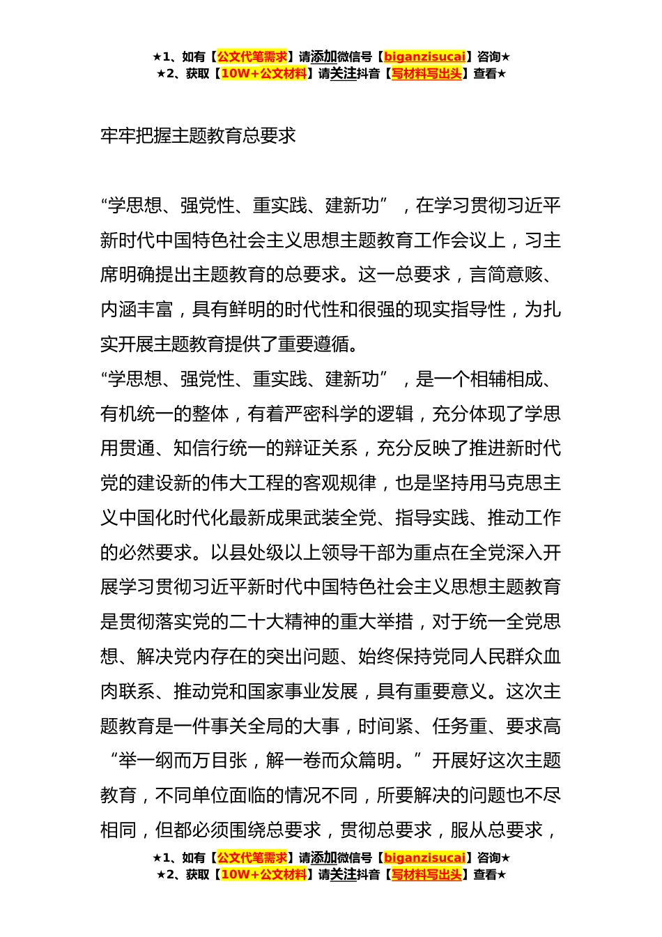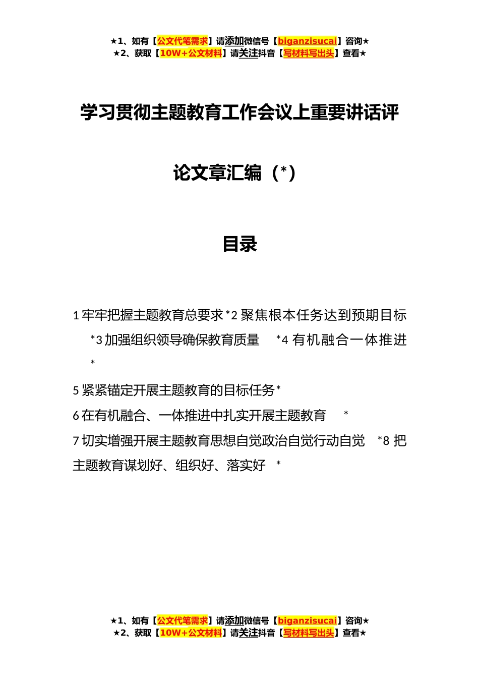 ★1、如有【公文代笔需求】请添加微信号【biganzisucai】咨询★★2、获取【10W+公文材料】请关注抖音【写材料写出头】查看★学习贯彻主题教育工作会议上重要讲话评论文章汇编(*)目录1牢牢把握主题教育总要求*2聚焦根本任务达到预期目标*3加强组织领导确保教育质量*4有机融合一体推进*5紧紧锚定开展主题教育的目标任务*6在有机融合、一体推进中扎实开展主题教育*7切实增强开展主题教育思想自觉政治自觉行动自觉*8把主题教育谋划好、组织好、落实好*★1、如有【公文代笔需求】请添加微信号【biganzisucai】咨询★★2、获取【10W+公文材料】请关注抖音【写材料写出头】查看★★1、如有【公文代笔需求】请添加微信号【biganzisucai】咨询★★2、获取【10W+公文材料】请关注抖音【写材料写出头】查看★牢牢把握主题教...