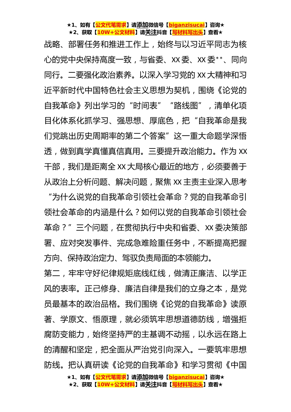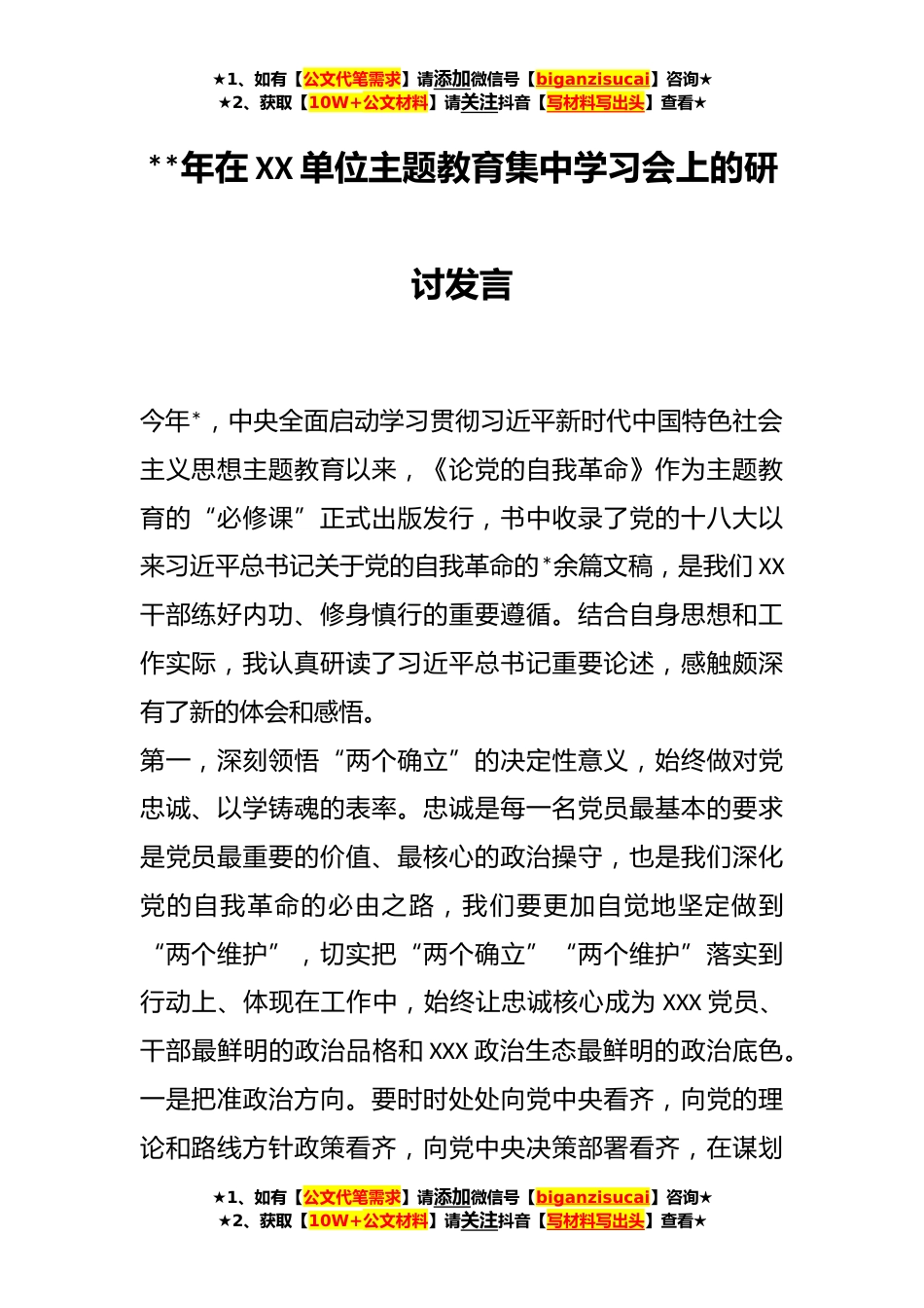 ★1、如有【公文代笔需求】请添加微信号【biganzisucai】咨询★★2、获取【10W+公文材料】请关注抖音【写材料写出头】查看★**年在XX单位主题教育集中学习会上的研讨发言今年*,中央全面启动学习贯彻习近平新时代中国特色社会主义思想主题教育以来,《论党的自我革命》作为主题教育的“必修课”正式出版发行,书中收录了党的十八大以来习近平总书记关于党的自我革命的*余篇文稿,是我们XX干部练好内功、修身慎行的重要遵循。结合自身思想和工作实际,我认真研读了习近平总书记重要论述,感触颇深有了新的体会和感悟。第一,深刻领悟“两个确立”的决定性意义,始终做对党忠诚、以学铸魂的表率。忠诚是每一名党员最基本的要求是党员最重要的价值、最核心的政治操守,也是我们深化党的自我革命的必由之路,我们要更...