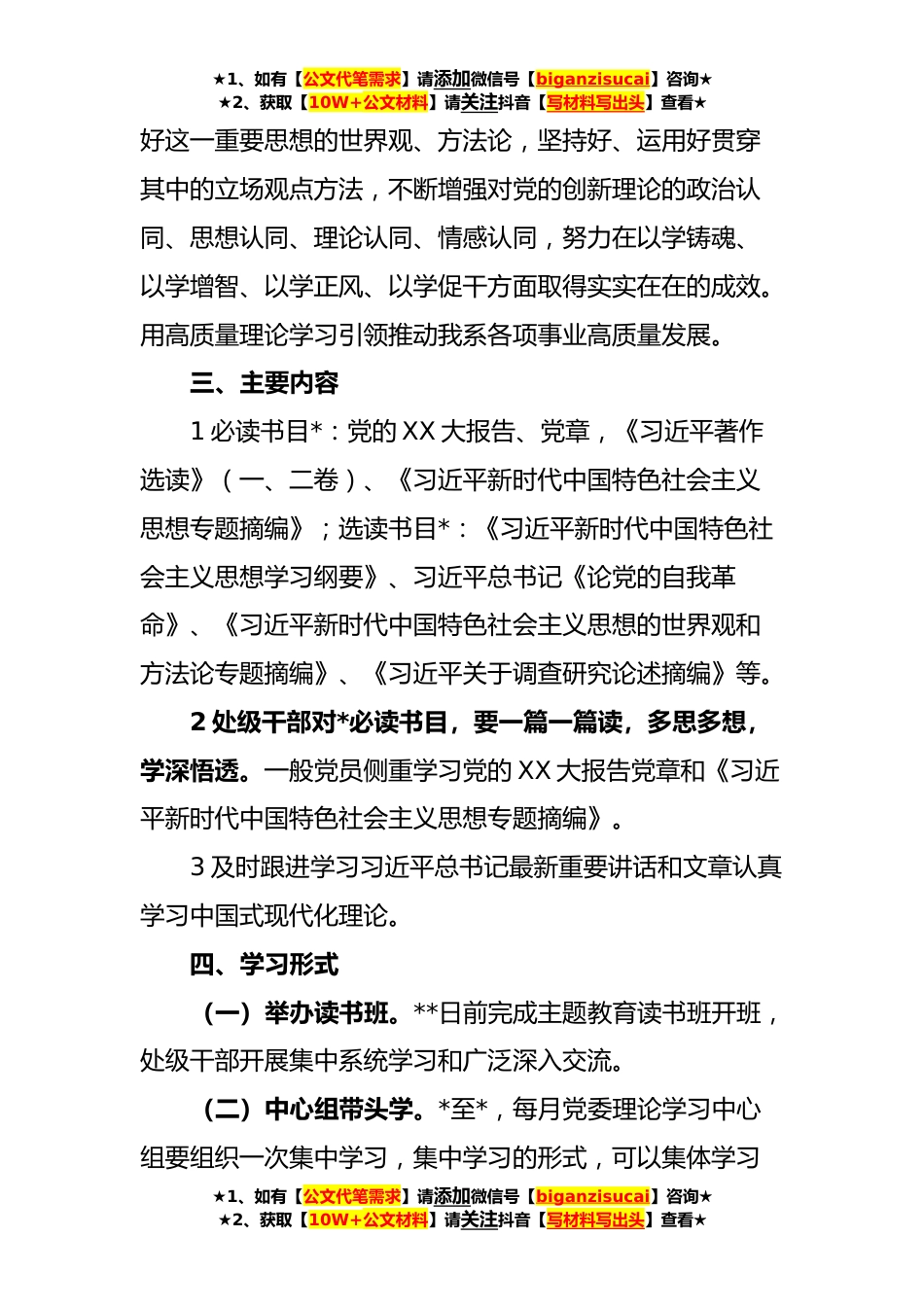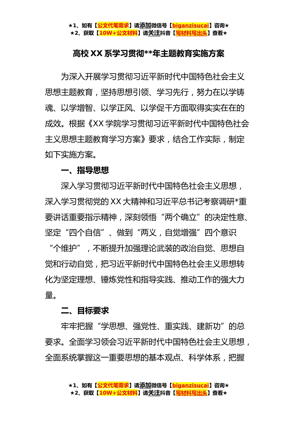 ★1、如有【公文代笔需求】请添加微信号【biganzisucai】咨询★★2、获取【10W+公文材料】请关注抖音【写材料写出头】查看★高校XX系学习贯彻**年主题教育实施方案为深入开展学习贯彻习近平新时代中国特色社会主义思想主题教育,坚持思想引领、学习先行,努力在以学铸魂、以学增智、以学正风、以学促干方面取得实实在在的成效。根据《XX学院学习贯彻习近平新时代中国特色社会主义思想主题教育学习方案》要求,结合工作实际,制定如下实施方案。一、指导思想深入学习贯彻习近平新时代中国特色社会主义思想,深入学习贯彻党的XX大精神和习近平总书记考察调研*重要讲话重要指示精神,深刻领悟“两个确立”的决定性意、坚定“四个自信”、做到“两义,自觉增强”四个意识“个维护”,不断提升加强理论武装的政治自觉、...