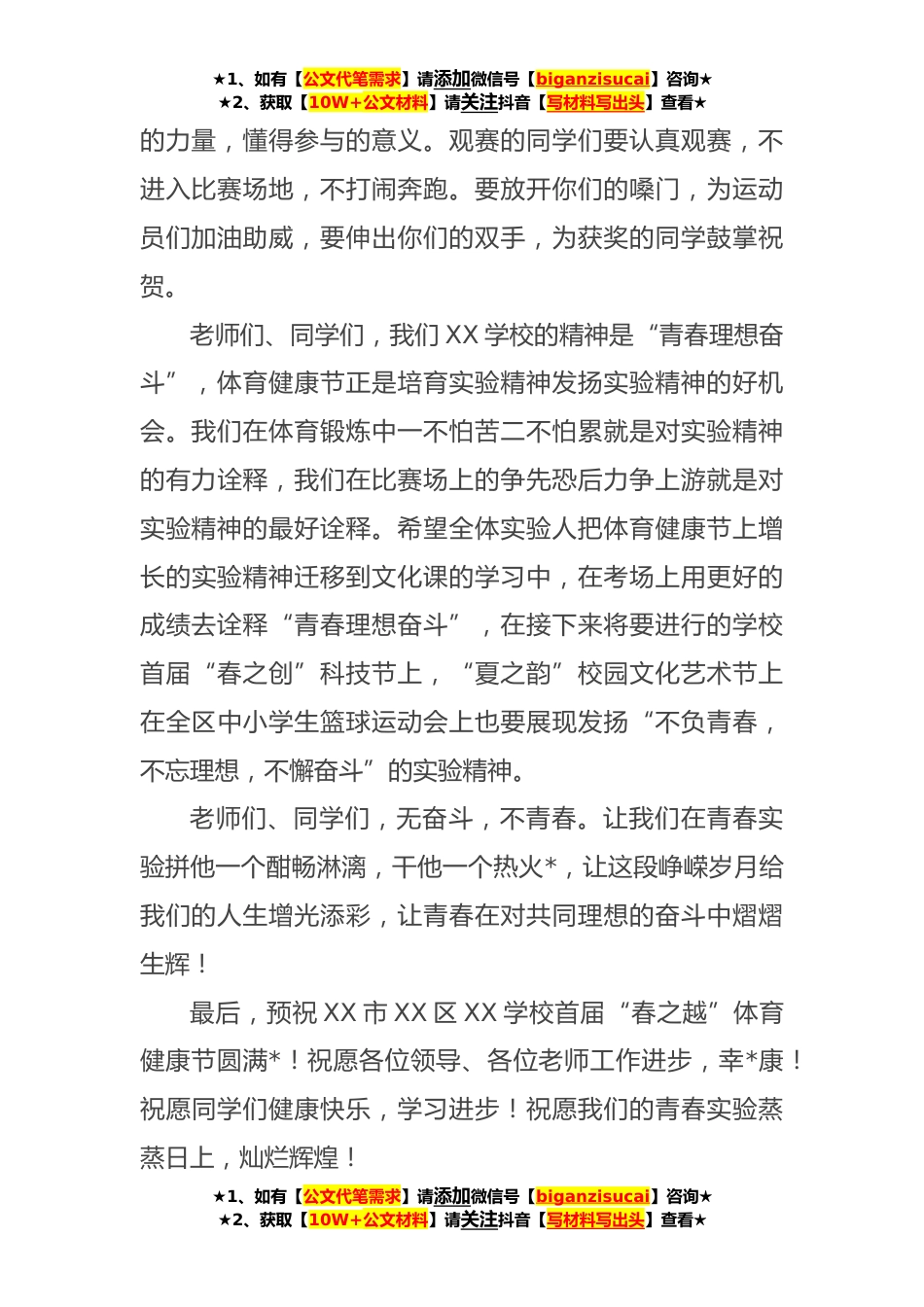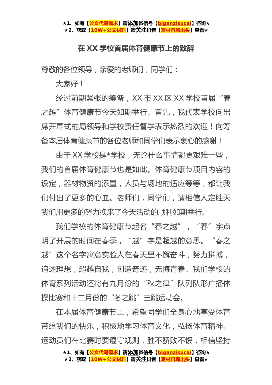 ★1、如有【公文代笔需求】请添加微信号【biganzisucai】咨询★★2、获取【10W+公文材料】请关注抖音【写材料写出头】查看★在XX学校首届体育健康节上的致辞尊敬的各位领导,亲爱的老师们,同学们:大家好!经过前期紧张的筹备,XX市XX区XX学校首届“春之越”体育健康节今天如期举行。首先,我代表学校向出席开幕式的局领导和学校责任督学表示热烈的欢迎!向筹备本届体育健康节的各位老师和同学们表示衷心的感谢!由于XX学校是*学校,无论什么事情都更艰难一些,我们的首届体育健康节也是如此。体育健康节项目内容的设定,器材物资的添置,人员与场地的适应等等,都让我们付出了更多的心血。老师们,同学们,请相信人定胜天我们用更多的努力换来了今天活动的顺利如期举行。我们学校的体育健康节起名“春之越”,“...