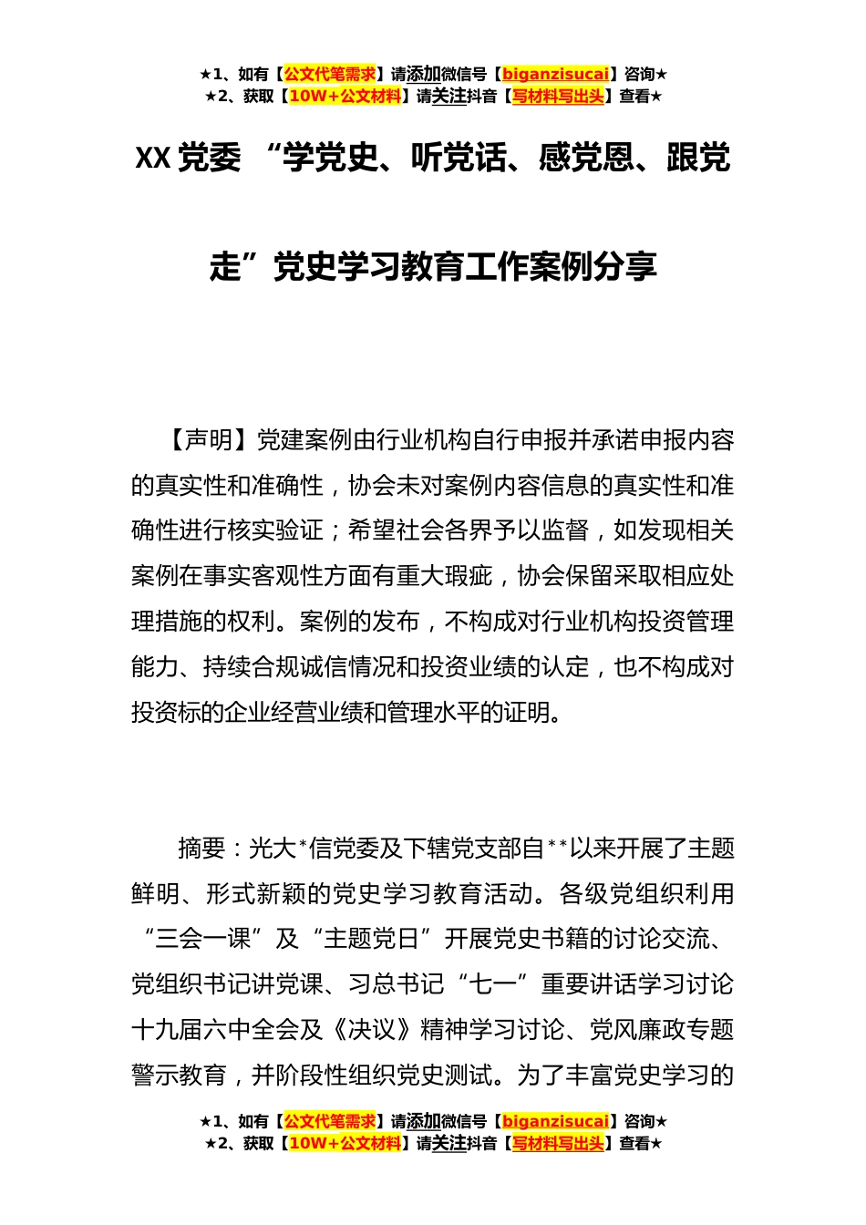 ★1、如有【公文代笔需求】请添加微信号【biganzisucai】咨询★★2、获取【10W+公文材料】请关注抖音【写材料写出头】查看★XX党委“学党史、听党话、感党恩、跟党走”党史学习教育工作案例分享【声明】党建案例由行业机构自行申报并承诺申报内容的真实性和准确性,协会未对案例内容信息的真实性和准确性进行核实验证;希望社会各界予以监督,如发现相关案例在事实客观性方面有重大瑕疵,协会保留采取相应处理措施的权利。案例的发布,不构成对行业机构投资管理能力、持续合规诚信情况和投资业绩的认定,也不构成对投资标的企业经营业绩和管理水平的证明。摘要:光大*信党委及下辖党支部自**以来开展了主题鲜明、形式新颖的党史学习教育活动。各级党组织利用“三会一课”及“主题党日”开展党史书籍的讨论交流、党...