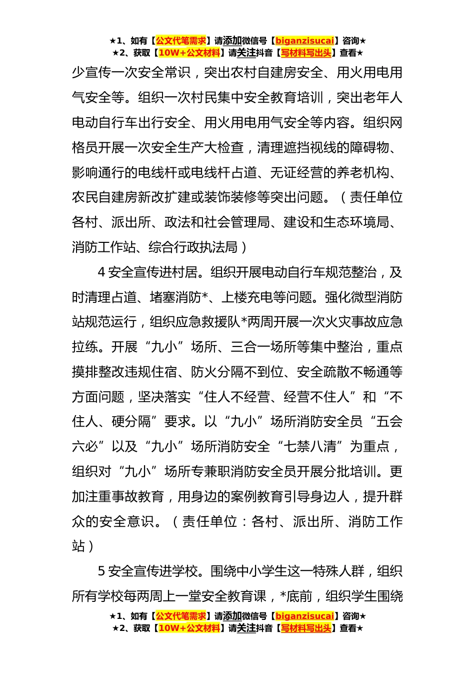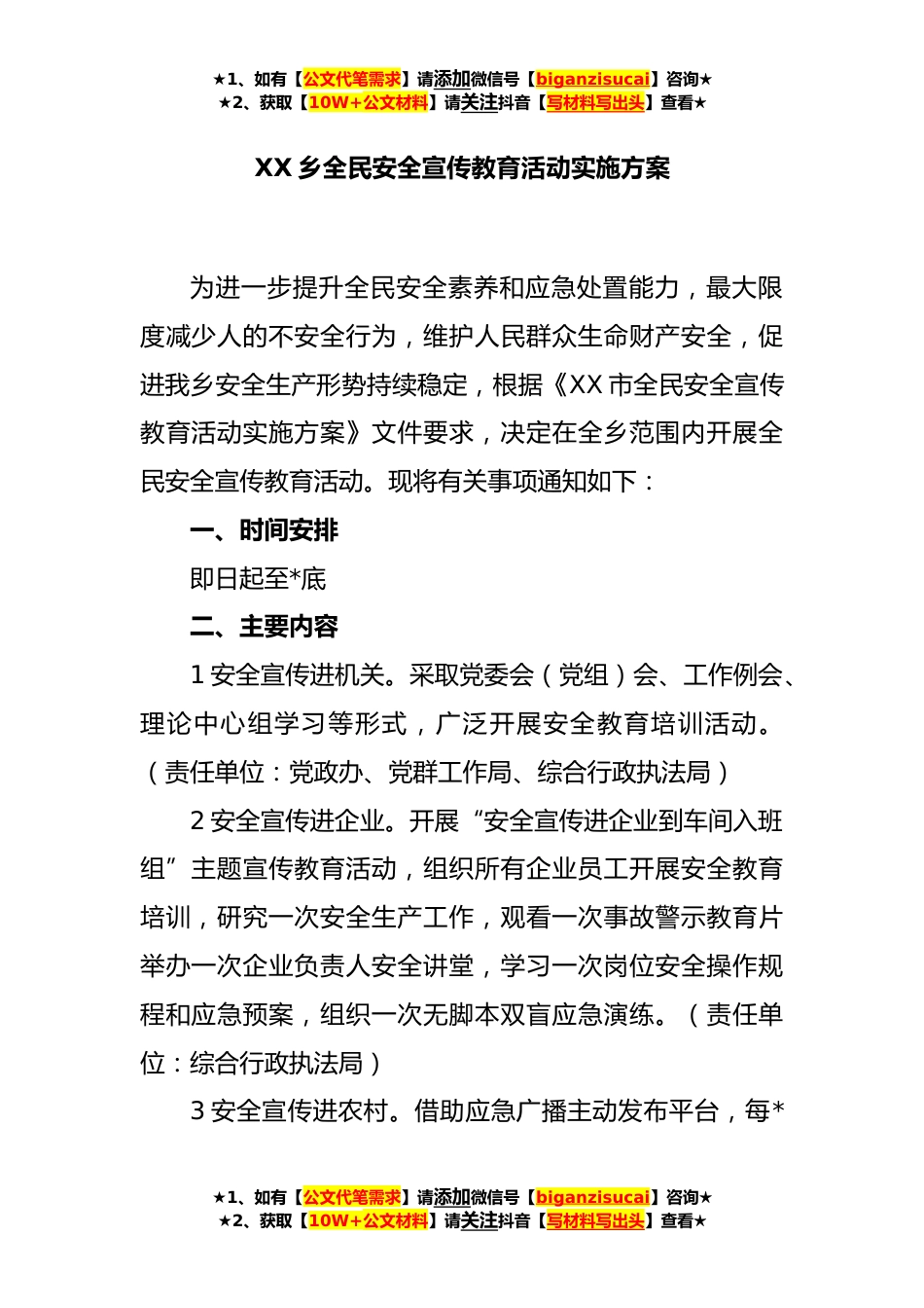 ★1、如有【公文代笔需求】请添加微信号【biganzisucai】咨询★★2、获取【10W+公文材料】请关注抖音【写材料写出头】查看★XX乡全民安全宣传教育活动实施方案为进一步提升全民安全素养和应急处置能力,最大限度减少人的不安全行为,维护人民群众生命财产安全,促进我乡安全生产形势持续稳定,根据《XX市全民安全宣传教育活动实施方案》文件要求,决定在全乡范围内开展全民安全宣传教育活动。现将有关事项通知如下:一、时间安排即日起至*底二、主要内容1安全宣传进机关。采取党委会(党组)会、工作例会、理论中心组学习等形式,广泛开展安全教育培训活动。(责任单位:党政办、党群工作局、综合行政执法局)2安全宣传进企业。开展“安全宣传进企业到车间入班组”主题宣传教育活动,组织所有企业员工开展安全教育...