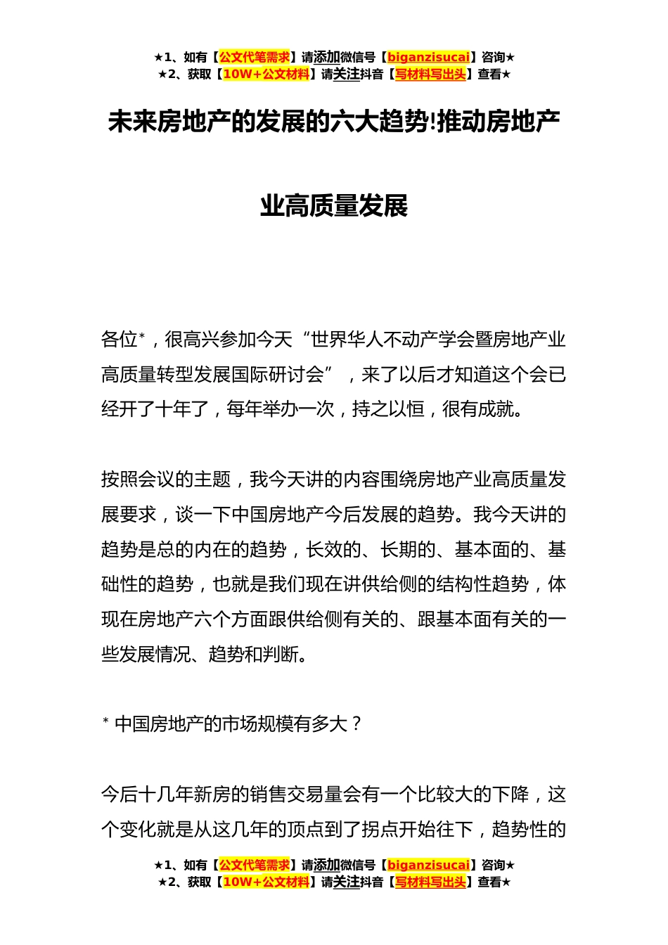 ★1、如有【公文代笔需求】请添加微信号【biganzisucai】咨询★★2、获取【10W+公文材料】请关注抖音【写材料写出头】查看★未来房地产的发展的六大趋势!推动房地产业高质量发展各位*,很高兴参加今天“世界华人不动产学会暨房地产业高质量转型发展国际研讨会”,来了以后才知道这个会已经开了十年了,每年举办一次,持之以恒,很有成就。按照会议的主题,我今天讲的内容围绕房地产业高质量发展要求,谈一下中国房地产今后发展的趋势。我今天讲的趋势是总的内在的趋势,长效的、长期的、基本面的、基础性的趋势,也就是我们现在讲供给侧的结构性趋势,体现在房地产六个方面跟供给侧有关的、跟基本面有关的一些发展情况、趋势和判断。*中国房地产的市场规模有多大?今后十几年新房的销售交易量会有一个比较大的下降...