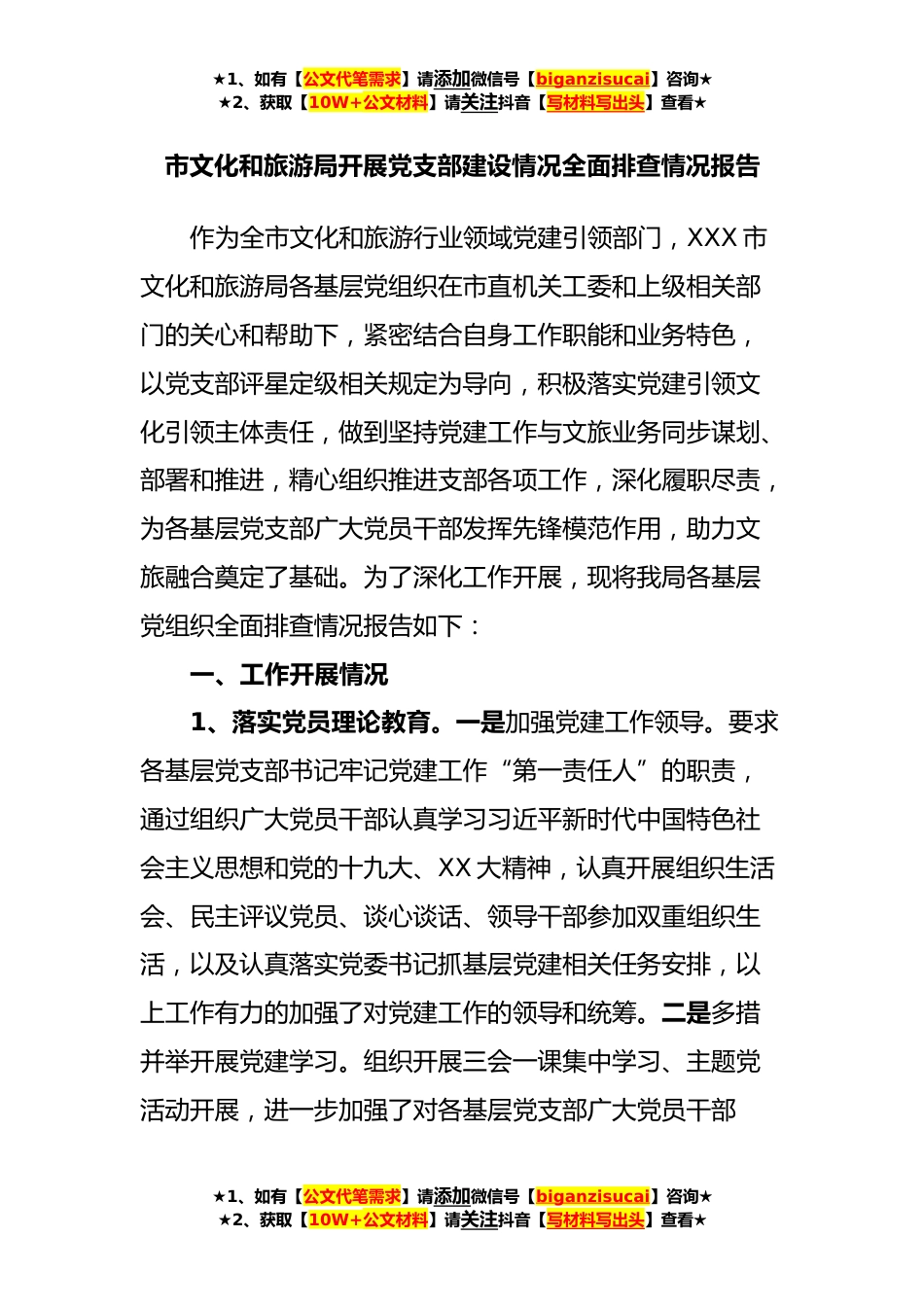 ★1、如有【公文代笔需求】请添加微信号【biganzisucai】咨询★★2、获取【10W+公文材料】请关注抖音【写材料写出头】查看★市文化和旅游局开展党支部建设情况全面排查情况报告作为全市文化和旅游行业领域党建引领部门,XXX市文化和旅游局各基层党组织在市直机关工委和上级相关部门的关心和帮助下,紧密结合自身工作职能和业务特色,以党支部评星定级相关规定为导向,积极落实党建引领文化引领主体责任,做到坚持党建工作与文旅业务同步谋划、部署和推进,精心组织推进支部各项工作,深化履职尽责,为各基层党支部广大党员干部发挥先锋模范作用,助力文旅融合奠定了基础。为了深化工作开展,现将我局各基层党组织全面排查情况报告如下:一、工作开展情况1、落实党员理论教育。一是加强党建工作领导。要求各基层党...