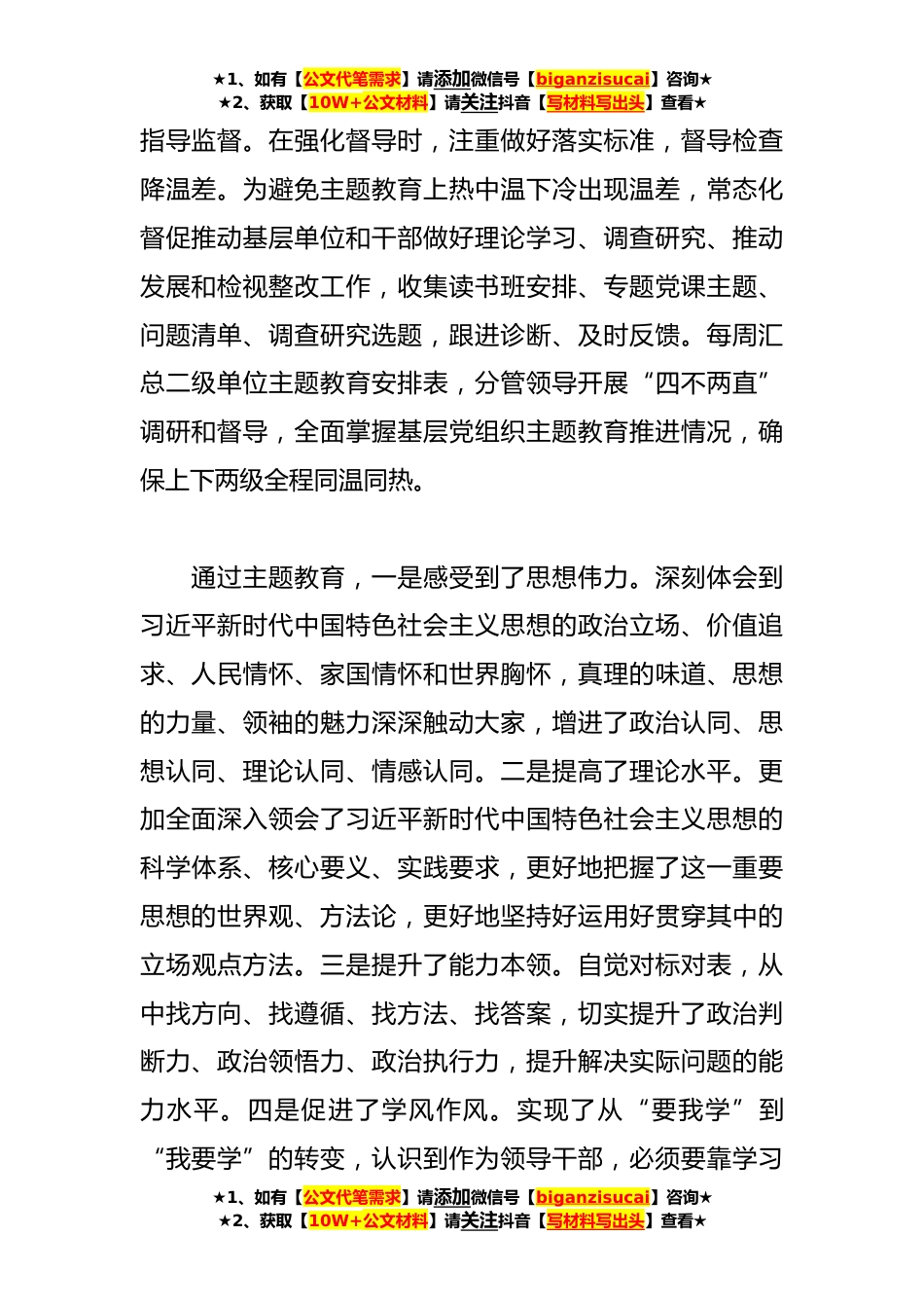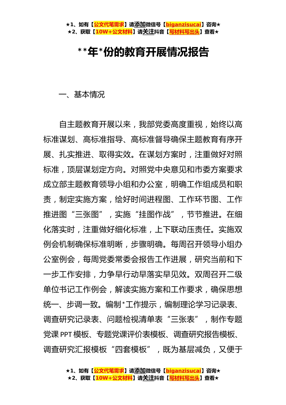 ★1、如有【公文代笔需求】请添加微信号【biganzisucai】咨询★★2、获取【10W+公文材料】请关注抖音【写材料写出头】查看★**年*份的教育开展情况报告一、基本情况自主题教育开展以来,我部党委高度重视,始终以高标准谋划、高标准指导、高标准督导确保主题教育有序开展、扎实推进、取得实效。在谋划方案时,注重做好对照标准,顶层谋划定方向。对照党中央意见和市委方案要求成立部主题教育领导小组和办公室,明确工作组成员和职责,制定实施方案,绘好时间进程图、工作环节图、工作推进图“三张图”,实施“挂图作战”,节节推进。在细化落实时,注重做好细化标准,上下联动压责任。实施双例会机制确保标准明晰,步骤明确。每周召开领导小组办公室例会,每周党委常委会报告工作进展,研究当前和下一步工作安排,...