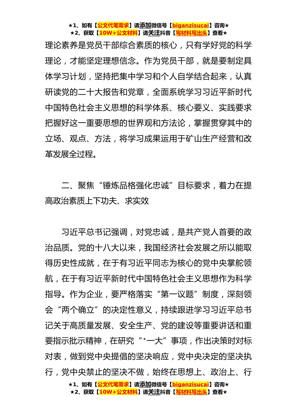 ★1、如有【公文代笔需求】请添加微信号【biganzisucai】咨询★★2、获取【10W+公文材料】请关注抖音【写材料写出头】查看★**年主题教育读书班上的交流发言稿深入开展学习贯彻习近平新时代中国特色社会主义思想主题教育,是党中央为全面贯彻党的二十大精神、统一全党思想、解决党内存在突出问题,始终保持党同人民群众血肉联系,推动党和国家事业发展所作的重*排部署。习近平总书记就这次主题教育,明确提出“凝心铸魂筑牢根本、锤炼品格强化忠诚、实干担当促进发展、践行宗旨为民造福、廉洁奉公树立新风”*方面的根本任务。公司紧扣主题教育学习材料,举办了为期一周的的读书班,主题鲜明、内容丰富,受益匪浅。下面,我围绕本次读书班学习内容,结合工作实际,简要谈几点体会,不妥之处,请批评指正。一、聚焦...