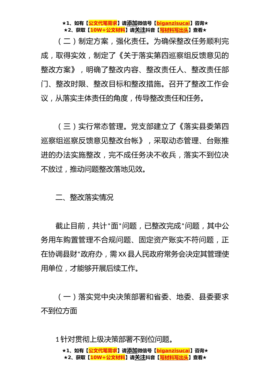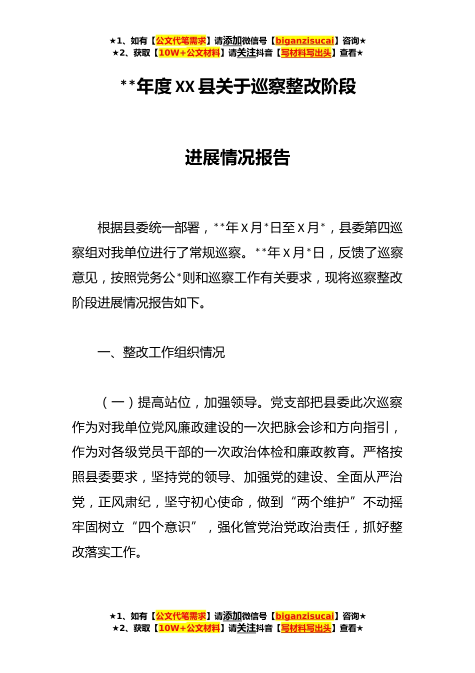 ★1、如有【公文代笔需求】请添加微信号【biganzisucai】咨询★★2、获取【10W+公文材料】请关注抖音【写材料写出头】查看★**年度XX县关于巡察整改阶段进展情况报告根据县委统一部署,**年X月*日至X月*,县委第四巡察组对我单位进行了常规巡察。**年X月*日,反馈了巡察意见,按照党务公*则和巡察工作有关要求,现将巡察整改阶段进展情况报告如下。一、整改工作组织情况(一)提高站位,加强领导。党支部把县委此次巡察作为对我单位党风廉政建设的一次把脉会诊和方向指引,作为对各级党员干部的一次政治体检和廉政教育。严格按照县委要求,坚持党的领导、加强党的建设、全面从严治党,正风肃纪,坚守初心使命,做到“两个维护”不动摇牢固树立“四个意识”,强化管党治党政治责任,抓好整改落实工作。★1、如有【...