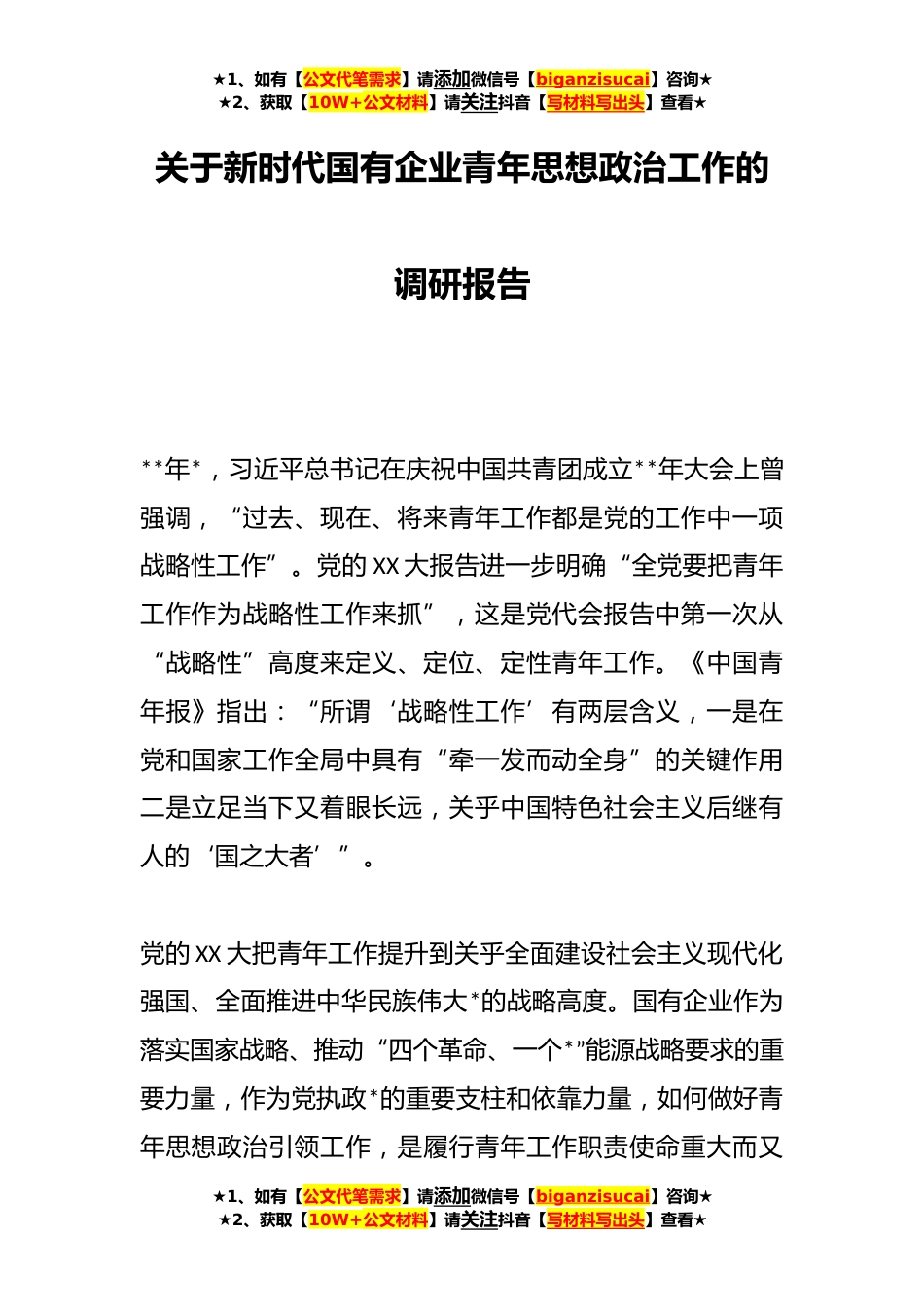 ★1、如有【公文代笔需求】请添加微信号【biganzisucai】咨询★★2、获取【10W+公文材料】请关注抖音【写材料写出头】查看★关于新时代国有企业青年思想政治工作的调研报告**年*,习近平总书记在庆祝中国共青团成立**年大会上曾强调,“过去、现在、将来青年工作都是党的工作中一项战略性工作”。党的XX大报告进一步明确“全党要把青年工作作为战略性工作来抓”,这是党代会报告中第一次从“战略性”高度来定义、定位、定性青年工作。《中国青年报》指出:“所谓‘战略性工作’有两层含义,一是在党和国家工作全局中具有“牵一发而动全身”的关键作用二是立足当下又着眼长远,关乎中国特色社会主义后继有人的‘国之大者’”。党的XX大把青年工作提升到关乎全面建设社会主义现代化强国、全面推进中华民族伟大*的战...