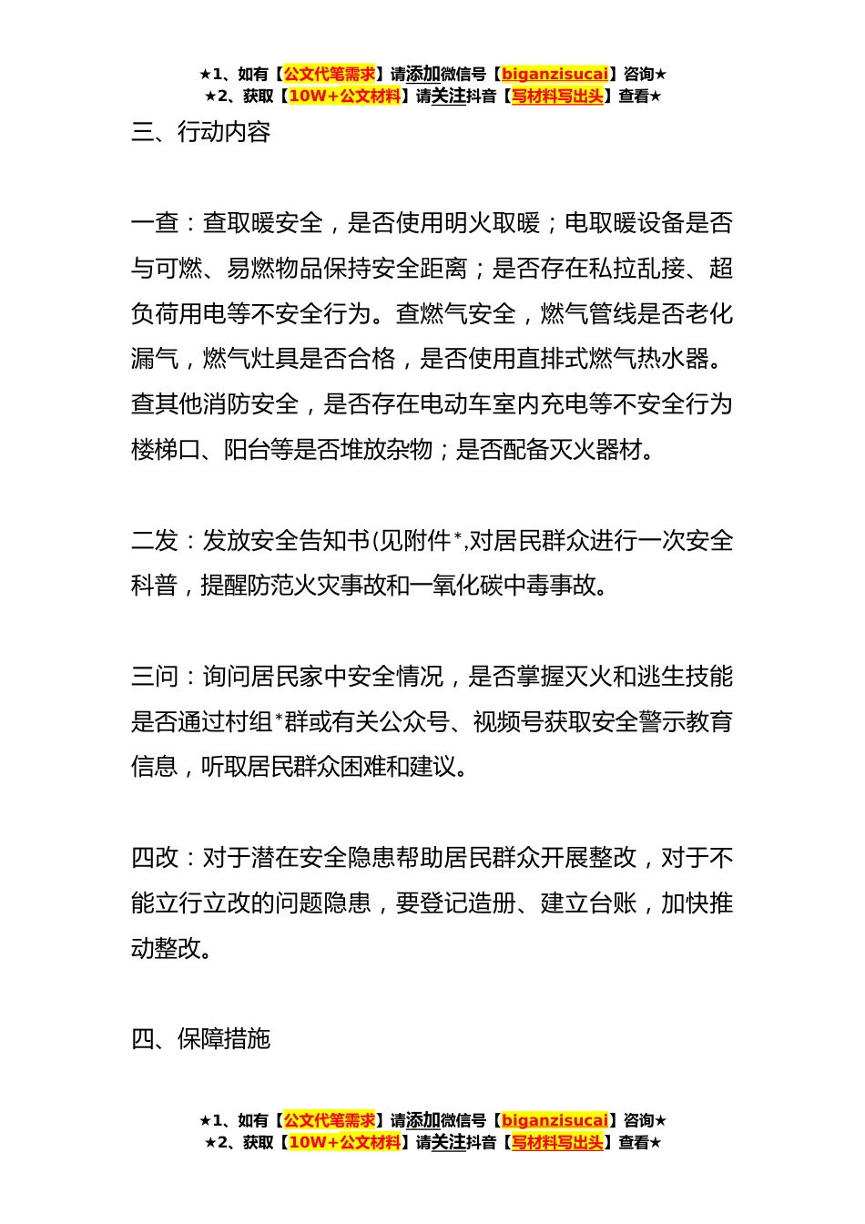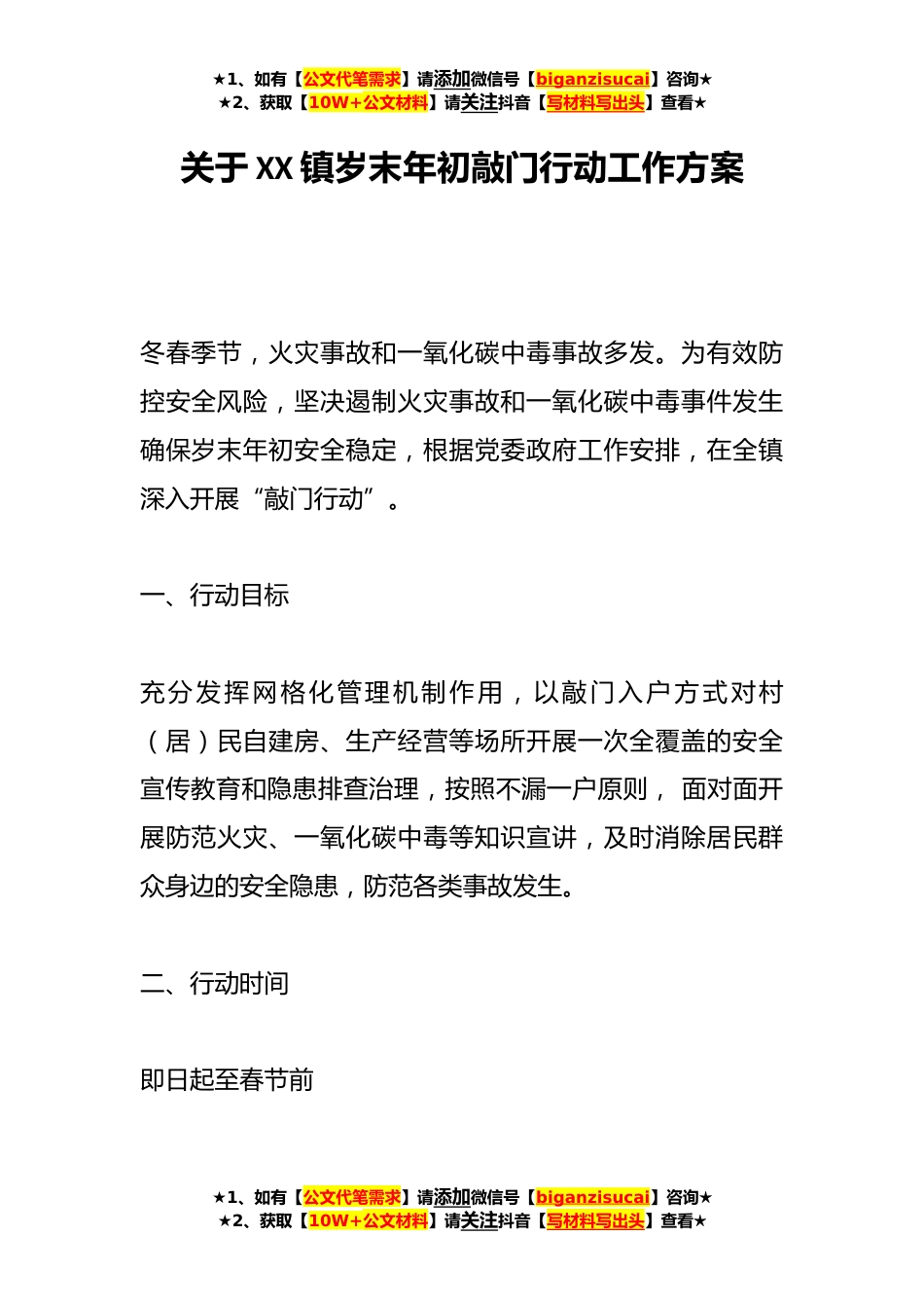 ★1、如有【公文代笔需求】请添加微信号【biganzisucai】咨询★★2、获取【10W+公文材料】请关注抖音【写材料写出头】查看★关于XX镇岁末年初敲门行动工作方案冬春季节,火灾事故和一氧化碳中毒事故多发。为有效防控安全风险,坚决遏制火灾事故和一氧化碳中毒事件发生确保岁末年初安全稳定,根据党委政府工作安排,在全镇深入开展“敲门行动”。一、行动目标充分发挥网格化管理机制作用,以敲门入户方式对村(居)民自建房、生产经营等场所开展一次全覆盖的安全宣传教育和隐患排查治理,按照不漏一户原则,面对面开展防范火灾、一氧化碳中毒等知识宣讲,及时消除居民群众身边的安全隐患,防范各类事故发生。二、行动时间即日起至春节前★1、如有【公文代笔需求】请添加微信号【biganzisucai】咨询★★2、获取【10W...