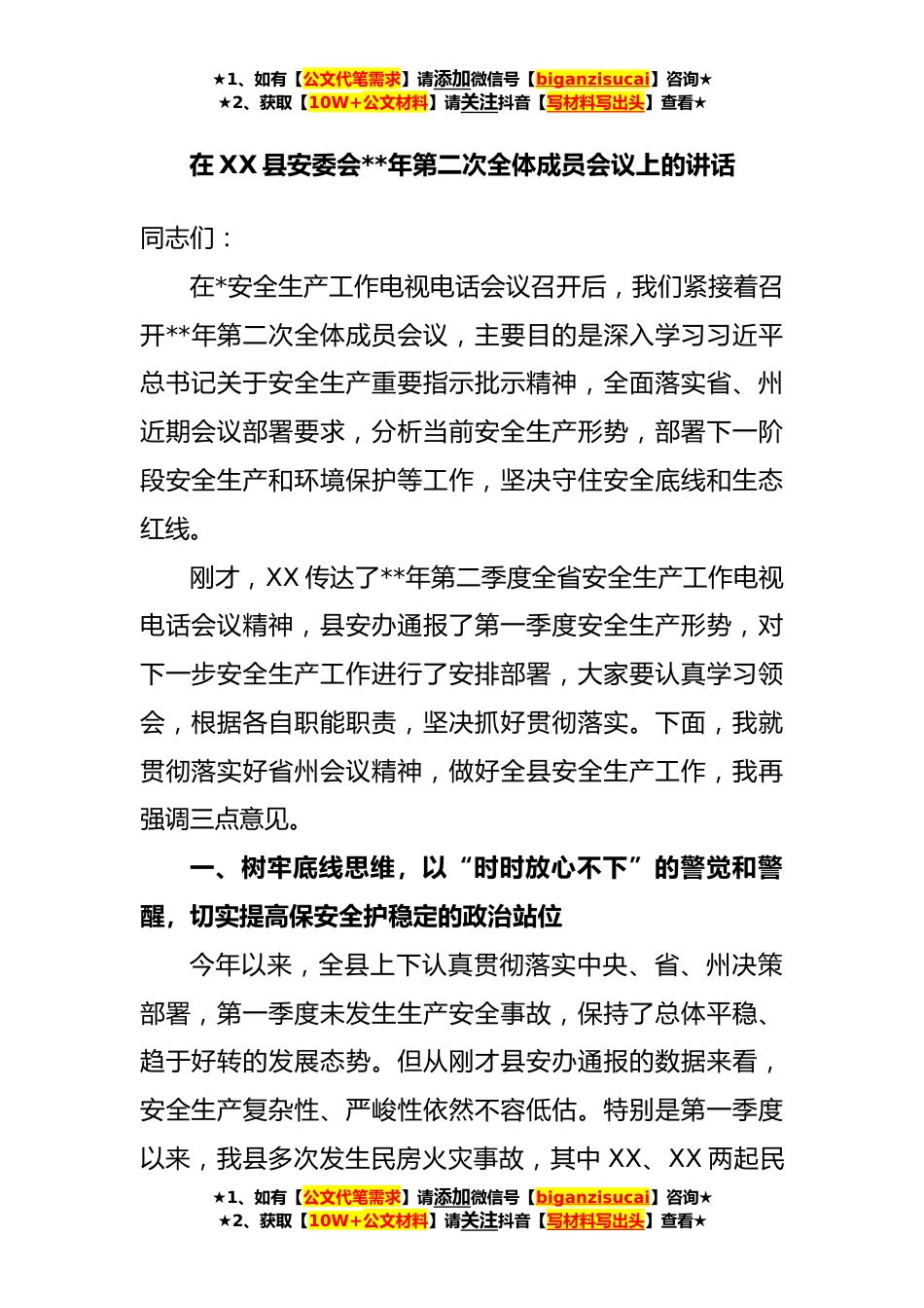 ★1、如有【公文代笔需求】请添加微信号【biganzisucai】咨询★★2、获取【10W+公文材料】请关注抖音【写材料写出头】查看★在XX县安委会**年第二次全体成员会议上的讲话同志们:在*安全生产工作电视电话会议召开后,我们紧接着召开**年第二次全体成员会议,主要目的是深入学习习近平总书记关于安全生产重要指示批示精神,全面落实省、州近期会议部署要求,分析当前安全生产形势,部署下一阶段安全生产和环境保护等工作,坚决守住安全底线和生态红线。刚才,XX传达了**年第二季度全省安全生产工作电视电话会议精神,县安办通报了第一季度安全生产形势,对下一步安全生产工作进行了安排部署,大家要认真学习领会,根据各自职能职责,坚决抓好贯彻落实。下面,我就贯彻落实好省州会议精神,做好全县安全生产工作,我...