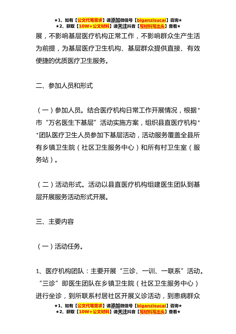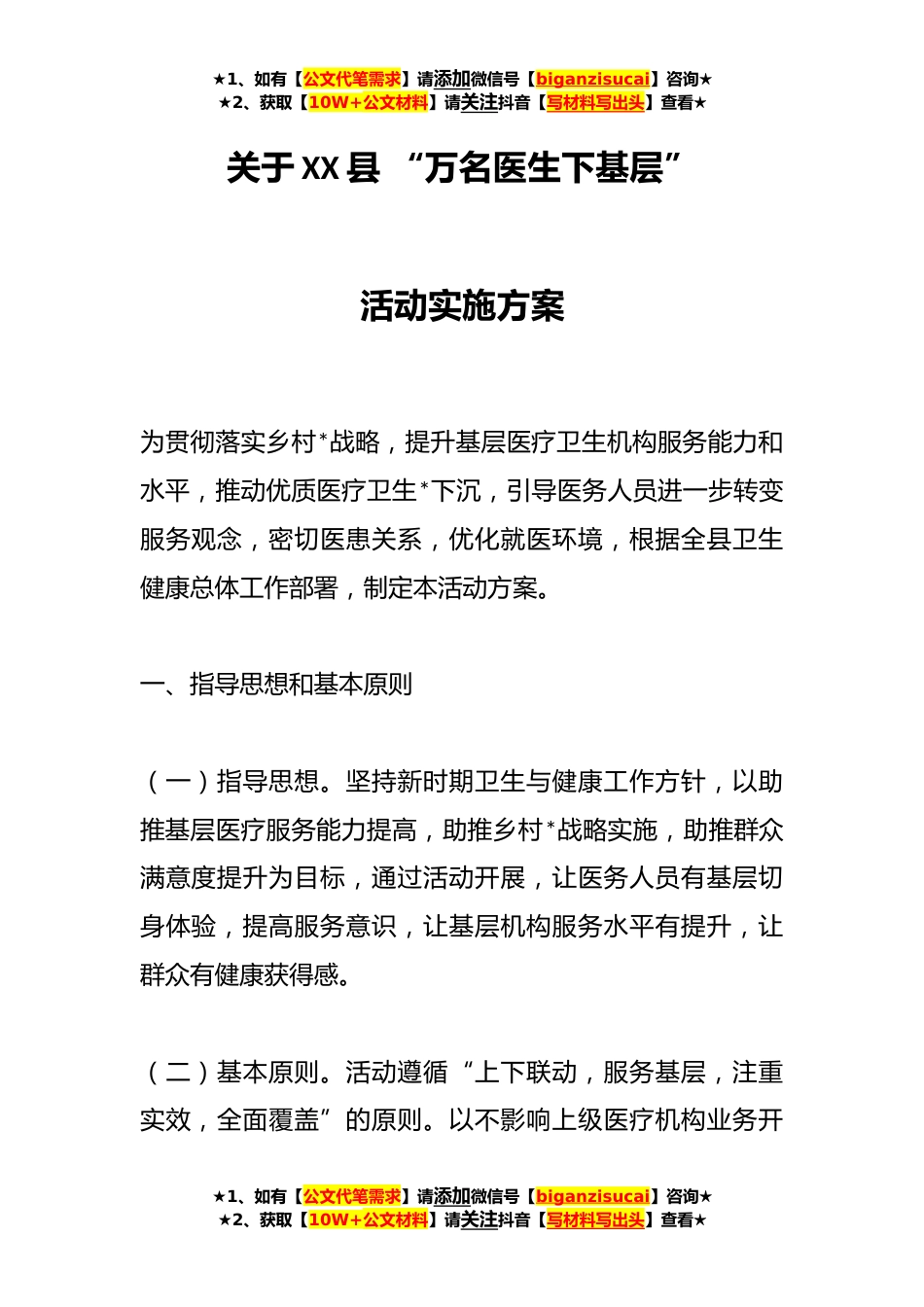 ★1、如有【公文代笔需求】请添加微信号【biganzisucai】咨询★★2、获取【10W+公文材料】请关注抖音【写材料写出头】查看★关于XX县“万名医生下基层”活动实施方案为贯彻落实乡村*战略,提升基层医疗卫生机构服务能力和水平,推动优质医疗卫生*下沉,引导医务人员进一步转变服务观念,密切医患关系,优化就医环境,根据全县卫生健康总体工作部署,制定本活动方案。一、指导思想和基本原则(一)指导思想。坚持新时期卫生与健康工作方针,以助推基层医疗服务能力提高,助推乡村*战略实施,助推群众满意度提升为目标,通过活动开展,让医务人员有基层切身体验,提高服务意识,让基层机构服务水平有提升,让群众有健康获得感。(二)基本原则。活动遵循“上下联动,服务基层,注重实效,全面覆盖”的原则。以不影响...