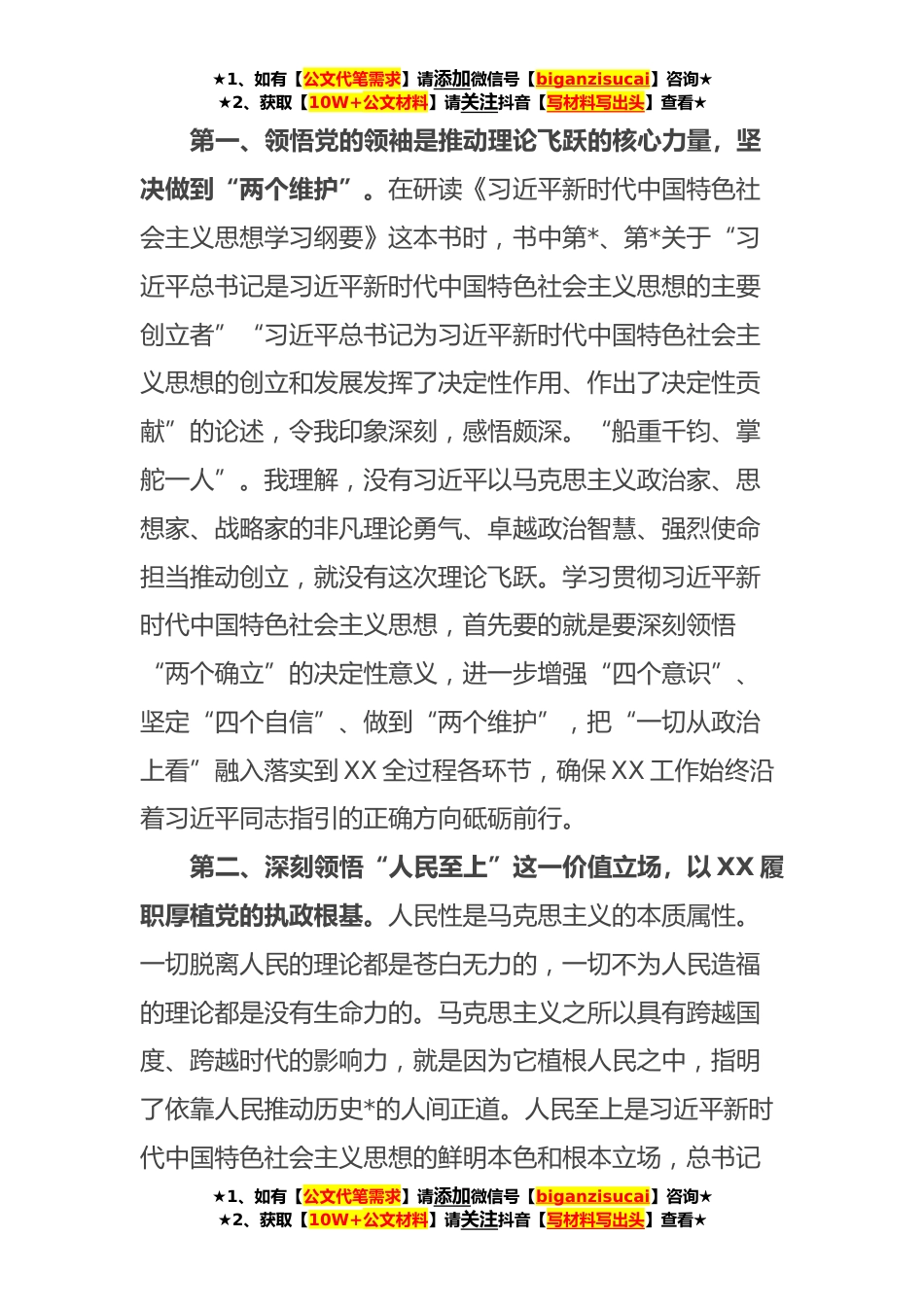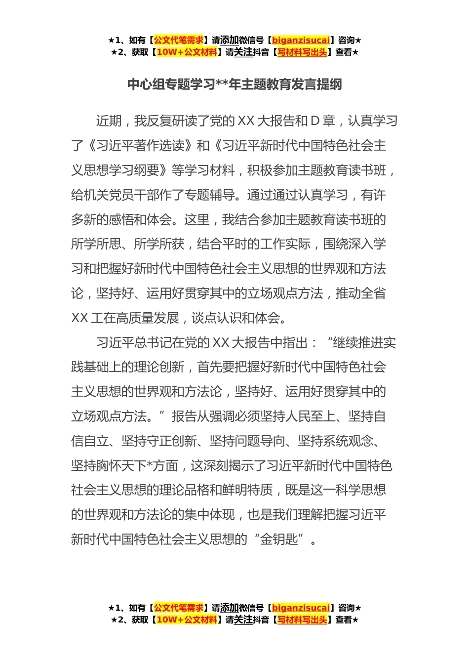 ★1、如有【公文代笔需求】请添加微信号【biganzisucai】咨询★★2、获取【10W+公文材料】请关注抖音【写材料写出头】查看★中心组专题学习**年主题教育发言提纲近期,我反复研读了党的XX大报告和D章,认真学习了《习近平著作选读》和《习近平新时代中国特色社会主义思想学习纲要》等学习材料,积极参加主题教育读书班,给机关党员干部作了专题辅导。通过通过认真学习,有许多新的感悟和体会。这里,我结合参加主题教育读书班的所学所思、所学所获,结合平时的工作实际,围绕深入学习和把握好新时代中国特色社会主义思想的世界观和方法论,坚持好、运用好贯穿其中的立场观点方法,推动全省XX工在高质量发展,谈点认识和体会。习近平总书记在党的XX大报告中指出:“继续推进实践基础上的理论创新,首先要把握好新时...