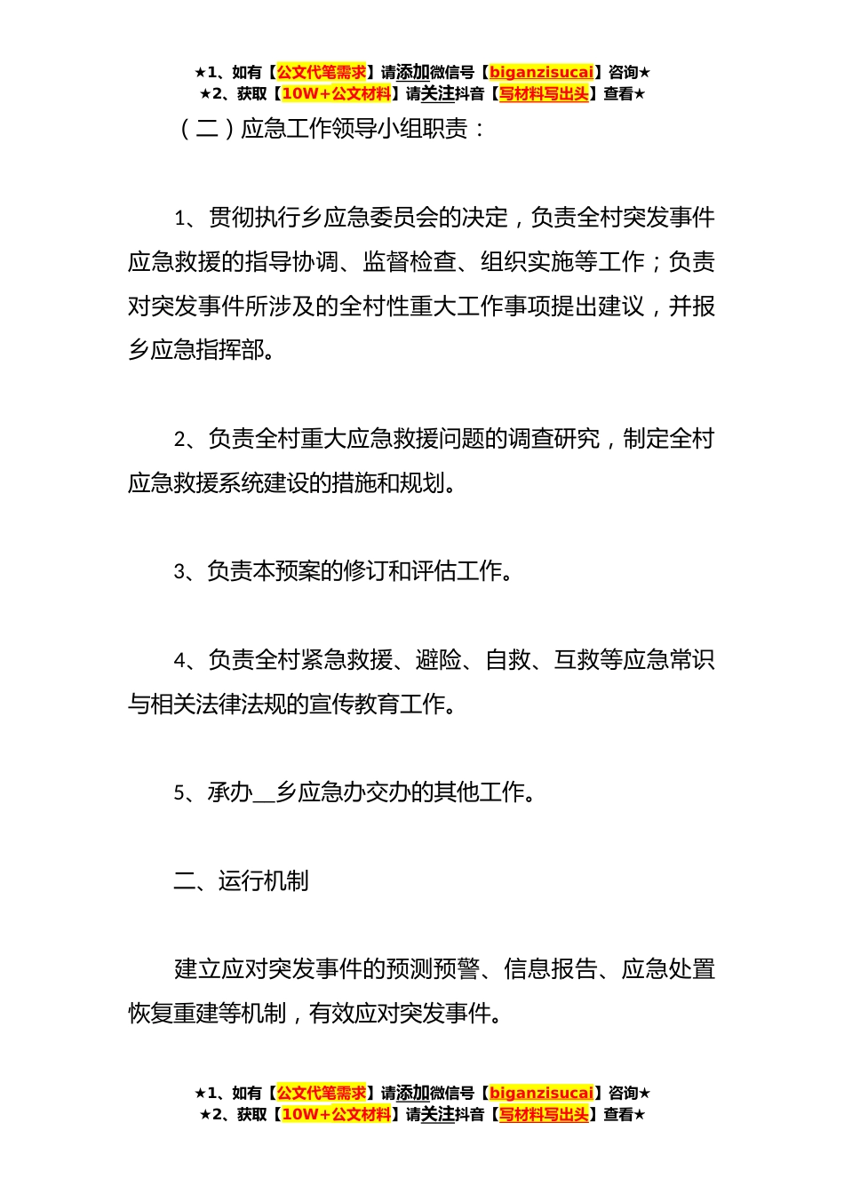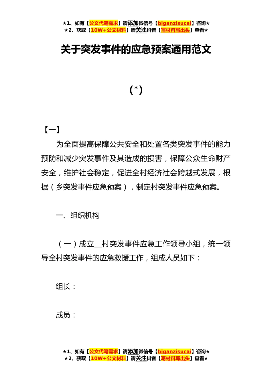 ★1、如有【公文代笔需求】请添加微信号【biganzisucai】咨询★★2、获取【10W+公文材料】请关注抖音【写材料写出头】查看★关于突发事件的应急预案通用范文(*)【一】为全面提高保障公共安全和处置各类突发事件的能力预防和减少突发事件及其造成的损害,保障公众生命财产安全,维护社会稳定,促进全村经济社会跨越式发展,根据(乡突发事件应急预案),制定村突发事件应急预案。一、组织机构(一)成立__村突发事件应急工作领导小组,统一领导全村突发事件的应急救援工作,组成人员如下:组长:成员:★1、如有【公文代笔需求】请添加微信号【biganzisucai】咨询★★2、获取【10W+公文材料】请关注抖音【写材料写出头】查看★★1、如有【公文代笔需求】请添加微信号【biganzisucai】咨询★★2、获取【10W+公文材...