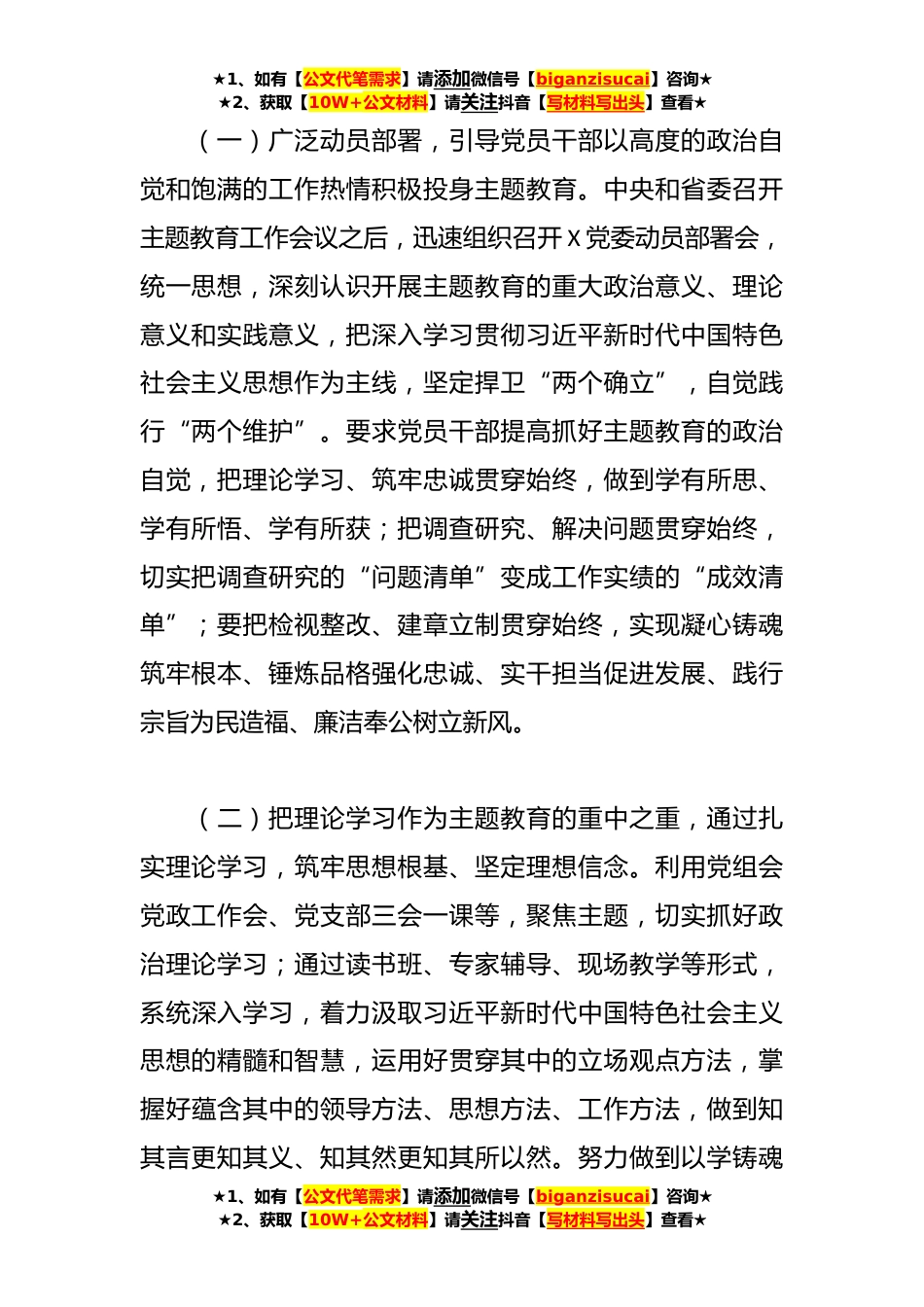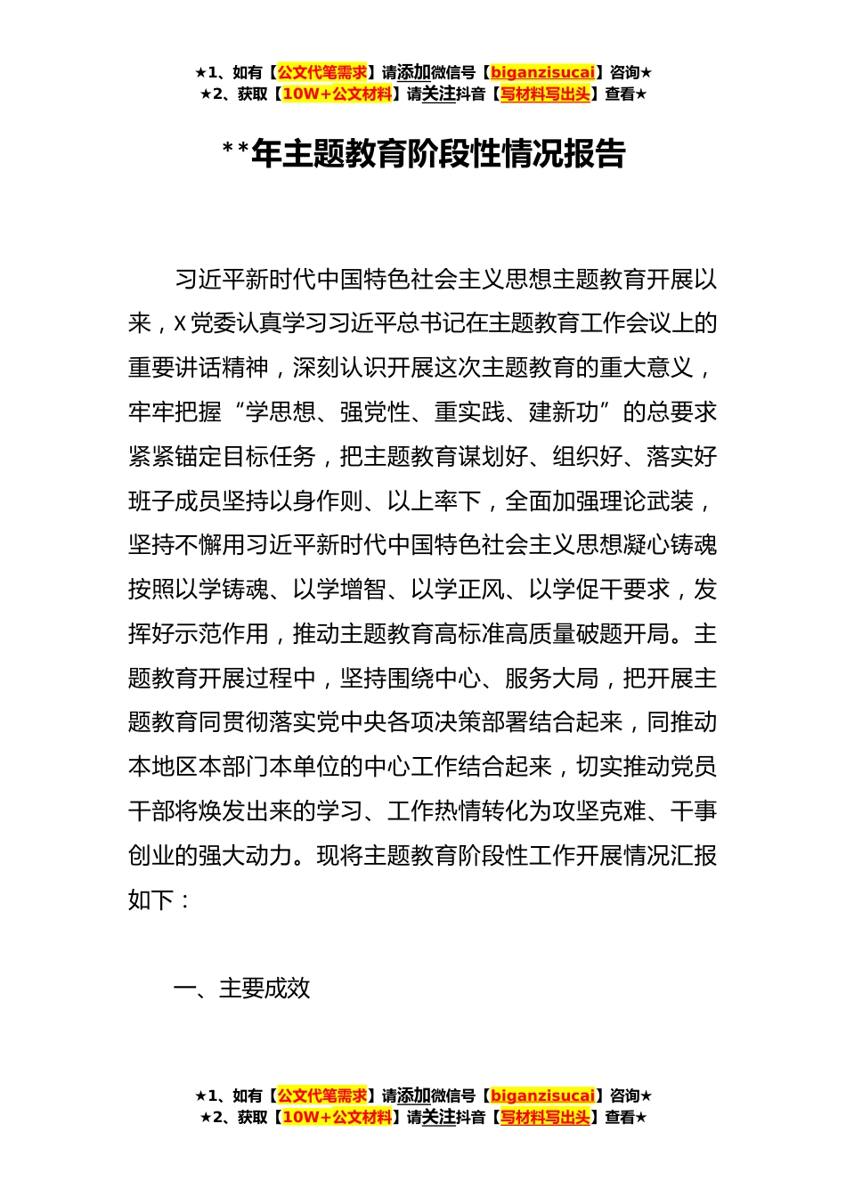 ★1、如有【公文代笔需求】请添加微信号【biganzisucai】咨询★★2、获取【10W+公文材料】请关注抖音【写材料写出头】查看★**年主题教育阶段性情况报告习近平新时代中国特色社会主义思想主题教育开展以来,X党委认真学习习近平总书记在主题教育工作会议上的重要讲话精神,深刻认识开展这次主题教育的重大意义,牢牢把握“学思想、强党性、重实践、建新功”的总要求紧紧锚定目标任务,把主题教育谋划好、组织好、落实好班子成员坚持以身作则、以上率下,全面加强理论武装,坚持不懈用习近平新时代中国特色社会主义思想凝心铸魂按照以学铸魂、以学增智、以学正风、以学促干要求,发挥好示范作用,推动主题教育高标准高质量破题开局。主题教育开展过程中,坚持围绕中心、服务大局,把开展主题教育同贯彻落实党中央各...