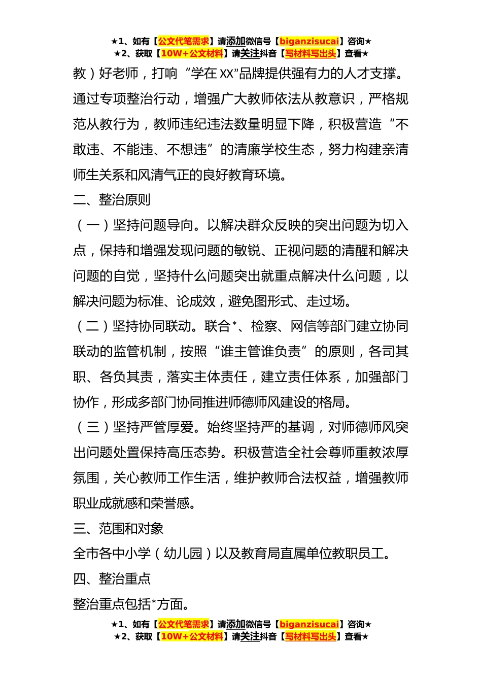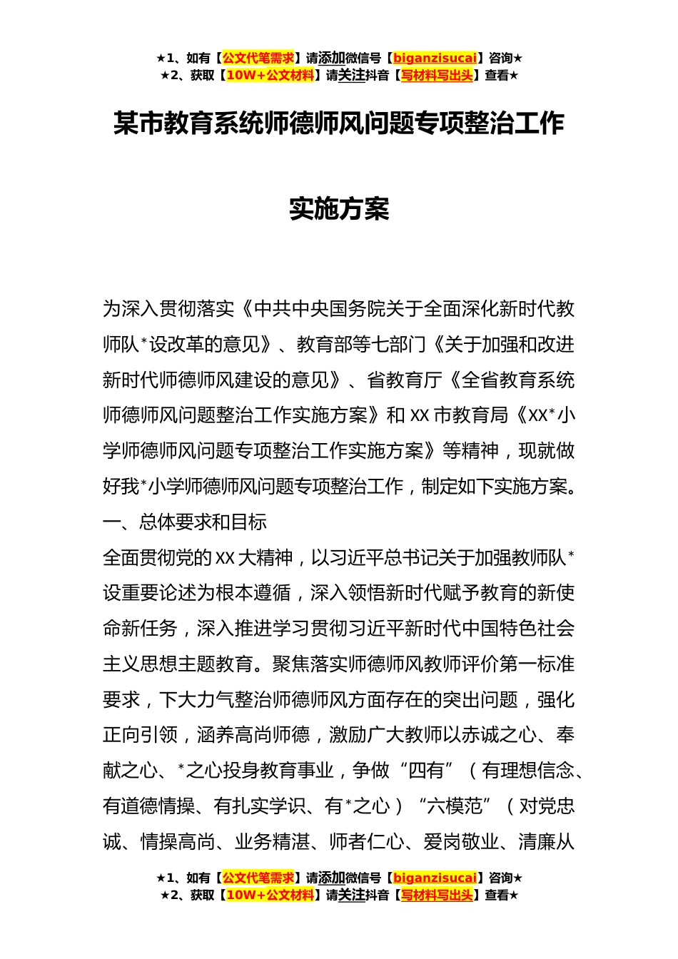 ★1、如有【公文代笔需求】请添加微信号【biganzisucai】咨询★★2、获取【10W+公文材料】请关注抖音【写材料写出头】查看★某市教育系统师德师风问题专项整治工作实施方案为深入贯彻落实《中共中央国务院关于全面深化新时代教师队*设改革的意见》、教育部等七部门《关于加强和改进新时代师德师风建设的意见》、省教育厅《全省教育系统师德师风问题整治工作实施方案》和XX市教育局《XX*小学师德师风问题专项整治工作实施方案》等精神,现就做好我*小学师德师风问题专项整治工作,制定如下实施方案。一、总体要求和目标全面贯彻党的XX大精神,以习近平总书记关于加强教师队*设重要论述为根本遵循,深入领悟新时代赋予教育的新使命新任务,深入推进学习贯彻习近平新时代中国特色社会主义思想主题教育。聚焦落实师德...