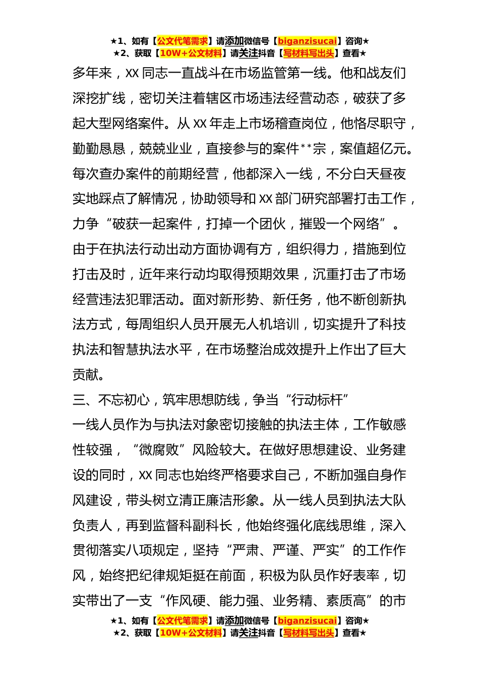 ★1、如有【公文代笔需求】请添加微信号【biganzisucai】咨询★★2、获取【10W+公文材料】请关注抖音【写材料写出头】查看★关于市场监督管理局先进人物事迹材料XXX同志在XX市市场监管战线履职的十几个年头中,面对复杂的执法环境,长期扎根基层一线,坚持不懈地与违法分子斗智斗勇,默默无闻、无私奉献,在平凡的工作岗位上做出了不平凡的业绩,出色地完成了本职和领导交办的各项工作任务,实际行动为XX市场治理工作作出了积极贡献,受到单位同事和各级领导的好评,近*来分别获得全省基层优秀个人、基层优秀团队、全市十佳执法人员等荣誉。一、深入学习,提升综合素质,争当“先锋队员”XXX同志时时保持学习紧迫感,抓早抓主动,高标准要求自己,高强度自我加压,注重加强党建和业务知识学习,围绕习近平总书记及...