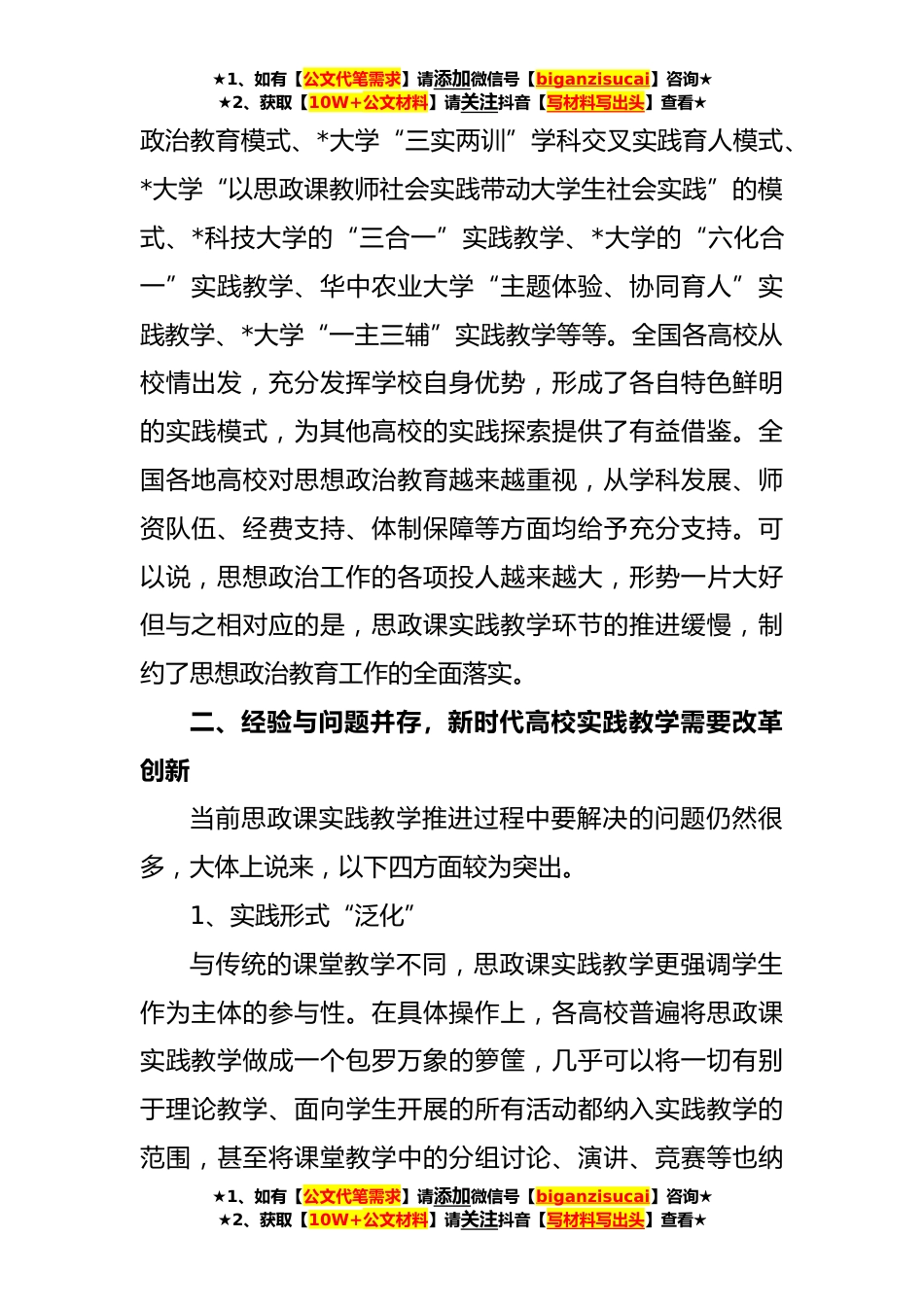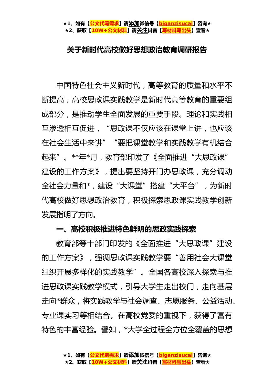 ★1、如有【公文代笔需求】请添加微信号【biganzisucai】咨询★★2、获取【10W+公文材料】请关注抖音【写材料写出头】查看★关于新时代高校做好思想政治教育调研报告中国特色社会主义新时代,高等教育的质量和水平不断提高,高校思政课实践教学是新时代高等教育的重要组成部分,是推动学生全面发展的重要手段。理论和实践相互渗透相互促进,“思政课不仅应该在课堂上讲,也应该在社会生活中来讲”“要把课堂教学和实践教学有机结合起来”。**年*月,教育部印发了《全面推进“大思政课”建设的工作方案》,提出要坚持开门办思政课,充分调动全社会力量和*,建设“大课堂”搭建“大平台”,为新时代高校做好思想政治教育,积极探索思政课实践教学创新发展指明了方向。一、高校积极推进特色鲜明的思政实践探索教育部...