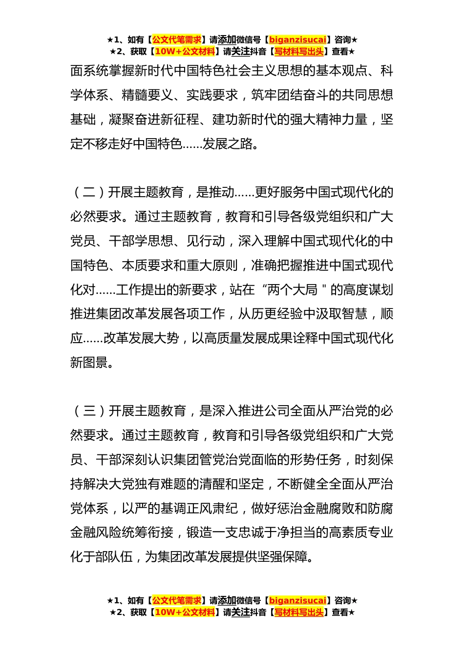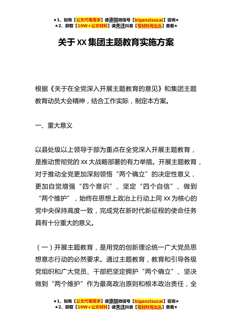 ★1、如有【公文代笔需求】请添加微信号【biganzisucai】咨询★★2、获取【10W+公文材料】请关注抖音【写材料写出头】查看★关于XX集团主题教育实施方案根据《关于在全党深入开展主题教育的意见》和集团主题教育动员大会精神,结合工作实际,制定本方案。一、重大意义以县处级以上领导于部为重点在全党深入开展主题教育,是推动贯彻党的XX大战略部署的有力举措。开展主题教育,对于推动全党更加深刻领悟“两个确立”的决定性意义,更加自觉增强“四个意识”、坚定“四个自信”、做到“两个维护”,始终在思想上政治上行动上同XX为核心的党中央保持高度一致,完成党在新时代新征程的使命任务具有十分重大的意义。(一)开展主题教育,是用党的创新理论统一广大党员思想意志行动的必然要求。通过主题教育,教育和引...