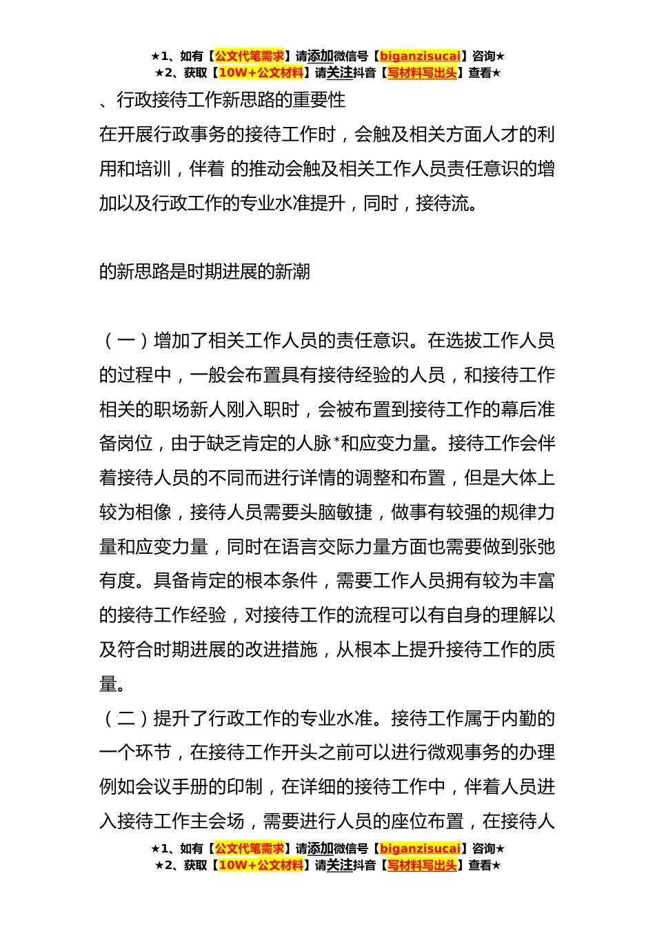★1、如有【公文代笔需求】请添加微信号【biganzisucai】咨询★★2、获取【10W+公文材料】请关注抖音【写材料写出头】查看★探析行政接待新思路行政接待工作需要注意的方面可以从把握信息的精确性动身,对接待工作的详情进行不断的强化和深化,同时,接待工作应当符合的要求,进行形式上的简化和精确化,定位每一次接待工作的目标,并在接待工作的基础上建立双方*沟通以及*的桥梁。接待工作需要由专业人员进行专业化的推动,这样才能确保接待工作顺当完成,有利于其他各项工作的协作,有效维护本部门的效益。、我国行政接待工作的现状目前,我国的接待工作在肯定程度上进行了的改革,在摒弃传统接待工作的固有缺陷之后,迎合了现代化的进展趋势,从形式和接待流程方面都进行了肯定的简化,但是由于处于接待工作的...