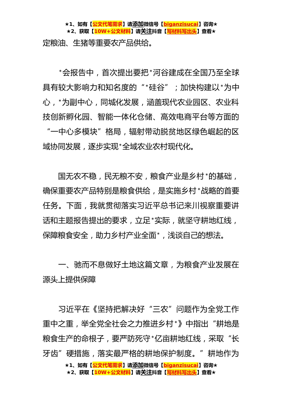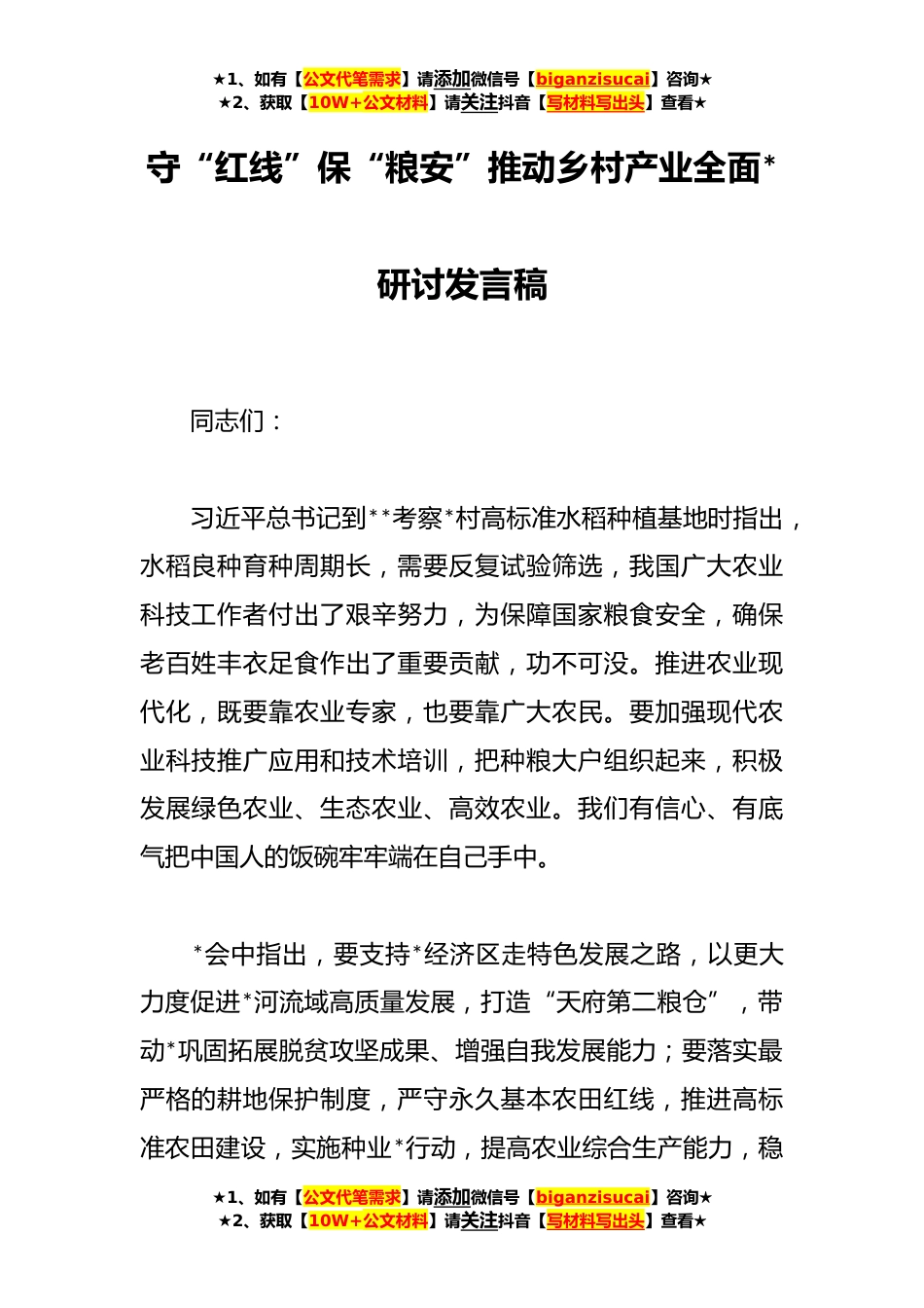 ★1、如有【公文代笔需求】请添加微信号【biganzisucai】咨询★★2、获取【10W+公文材料】请关注抖音【写材料写出头】查看★守“红线”保“粮安”推动乡村产业全面*研讨发言稿同志们:习近平总书记到**考察*村高标准水稻种植基地时指出,水稻良种育种周期长,需要反复试验筛选,我国广大农业科技工作者付出了艰辛努力,为保障国家粮食安全,确保老百姓丰衣足食作出了重要贡献,功不可没。推进农业现代化,既要靠农业专家,也要靠广大农民。要加强现代农业科技推广应用和技术培训,把种粮大户组织起来,积极发展绿色农业、生态农业、高效农业。我们有信心、有底气把中国人的饭碗牢牢端在自己手中。*会中指出,要支持*经济区走特色发展之路,以更大力度促进*河流域高质量发展,打造“天府第二粮仓”,带动*巩固拓展...