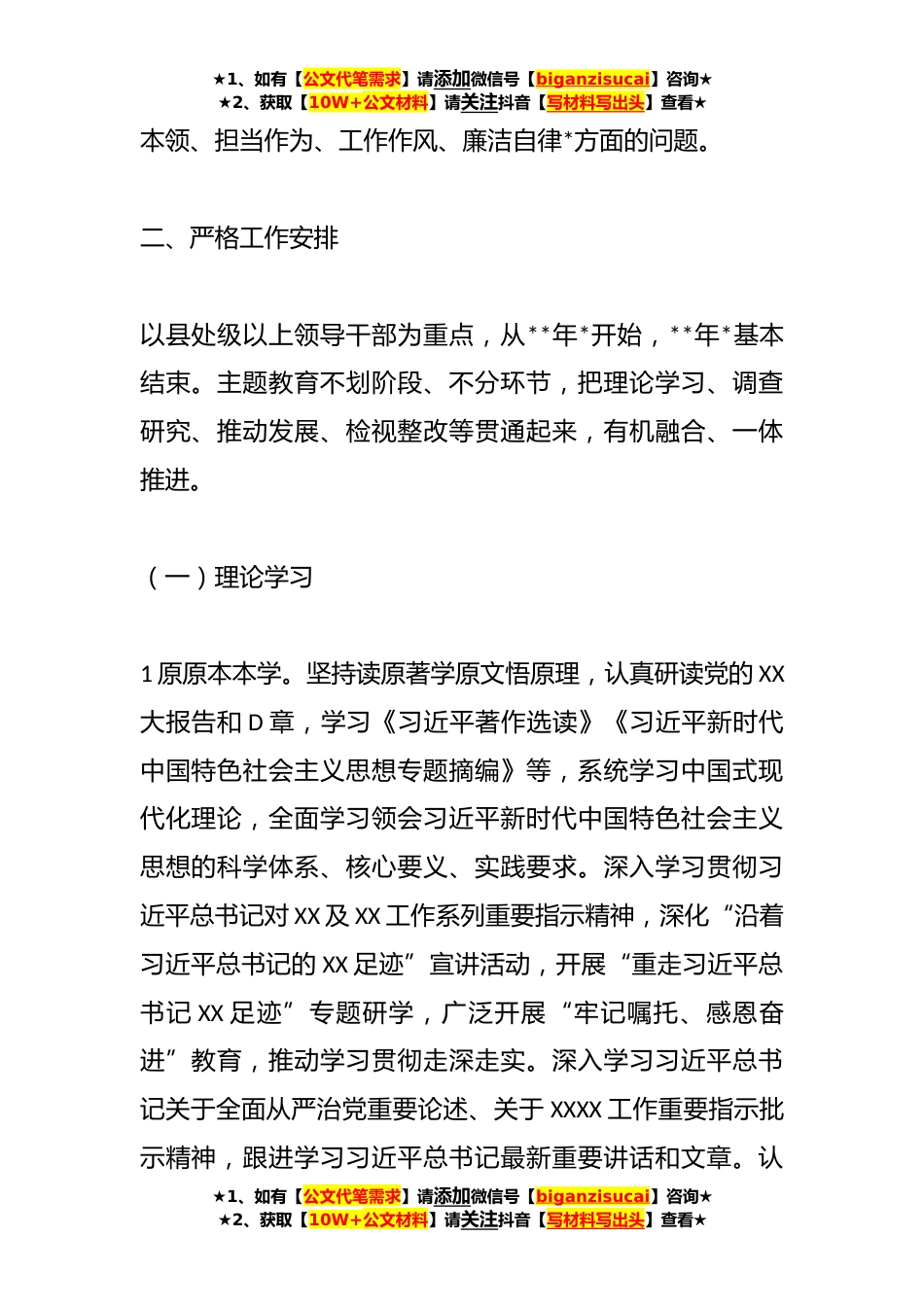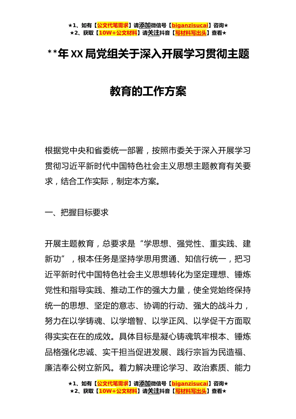 ★1、如有【公文代笔需求】请添加微信号【biganzisucai】咨询★★2、获取【10W+公文材料】请关注抖音【写材料写出头】查看★**年XX局党组关于深入开展学习贯彻主题教育的工作方案根据党中央和省委统一部署,按照市委关于深入开展学习贯彻习近平新时代中国特色社会主义思想主题教育有关要求,结合工作实际,制定本方案。一、把握目标要求开展主题教育,总要求是“学思想、强党性、重实践、建新功”,根本任务是坚持学思用贯通、知信行统一,把习近平新时代中国特色社会主义思想转化为坚定理想、锤炼党性和指导实践、推动工作的强大力量,使全党始终保持统一的思想、坚定的意志、协调的行动、强大的战斗力,努力在以学铸魂、以学增智、以学正风、以学促干方面取得实实在在的成效。具体目标是凝心铸魂筑牢根本、锤炼...