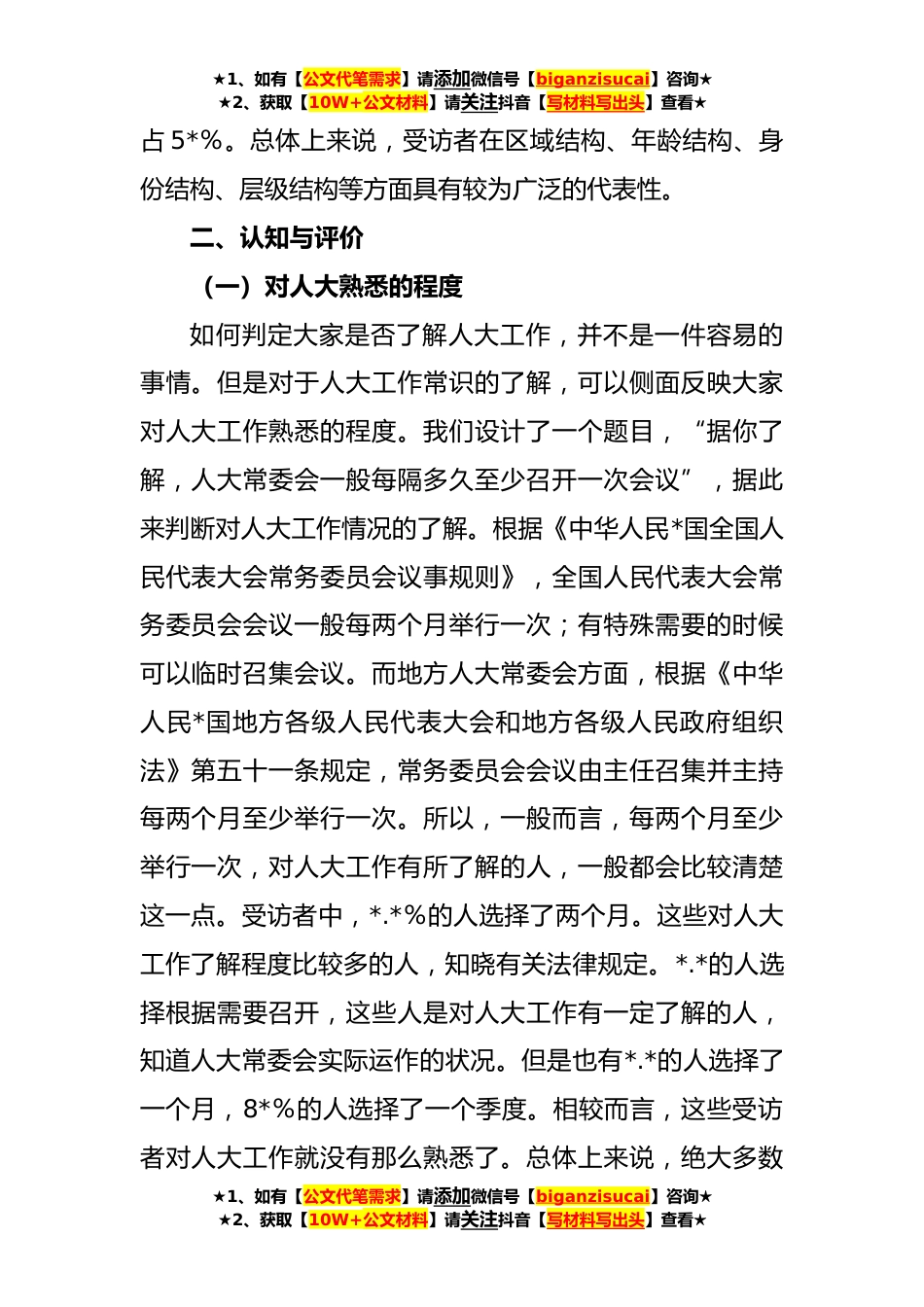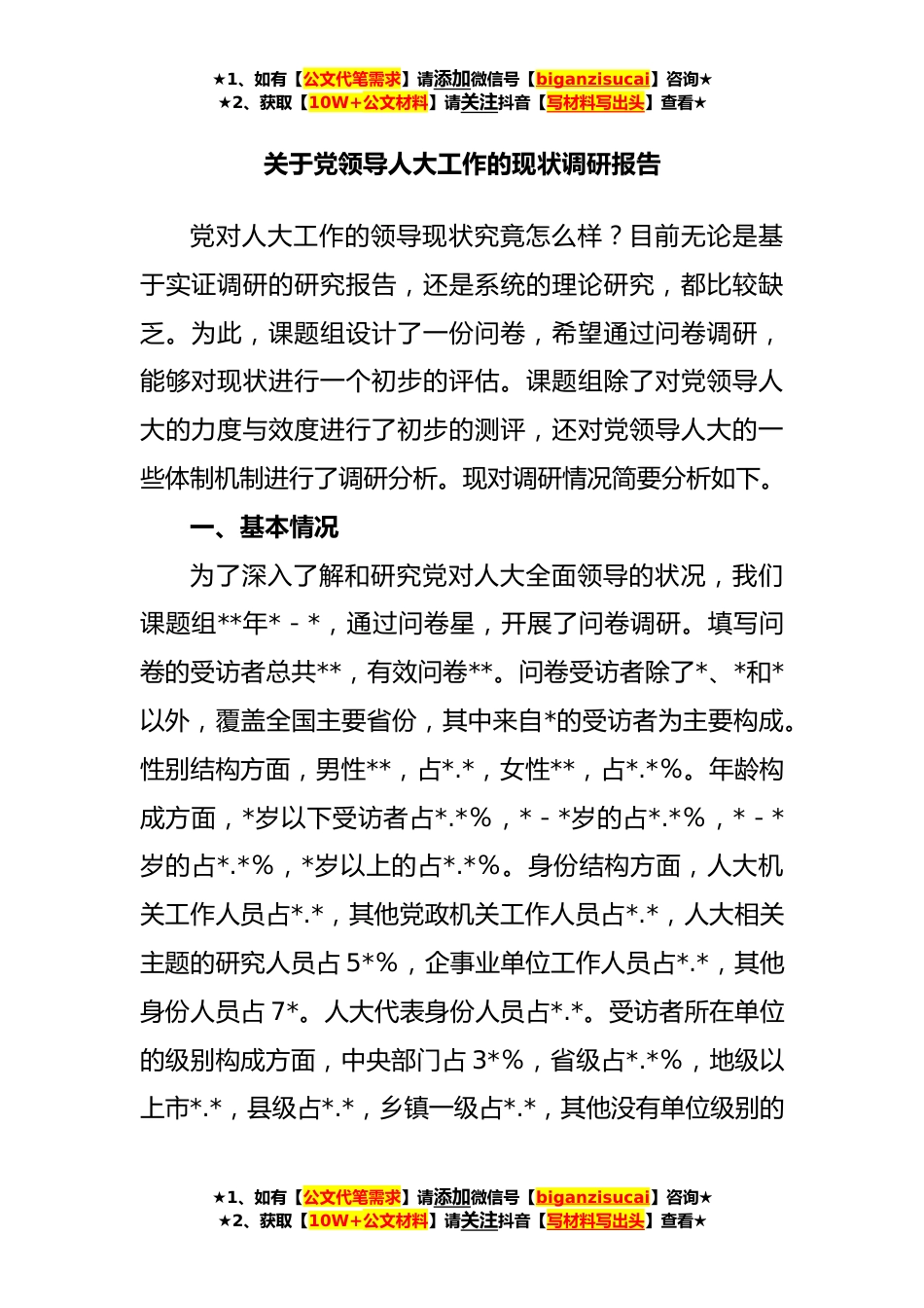 ★1、如有【公文代笔需求】请添加微信号【biganzisucai】咨询★★2、获取【10W+公文材料】请关注抖音【写材料写出头】查看★关于党领导人大工作的现状调研报告党对人大工作的领导现状究竟怎么样?目前无论是基于实证调研的研究报告,还是系统的理论研究,都比较缺乏。为此,课题组设计了一份问卷,希望通过问卷调研,能够对现状进行一个初步的评估。课题组除了对党领导人大的力度与效度进行了初步的测评,还对党领导人大的一些体制机制进行了调研分析。现对调研情况简要分析如下。一、基本情况为了深入了解和研究党对人大全面领导的状况,我们课题组**年*-*,通过问卷星,开展了问卷调研。填写问卷的受访者总共**,有效问卷**。问卷受访者除了*、*和*以外,覆盖全国主要省份,其中来自*的受访者为主要构成。性别...