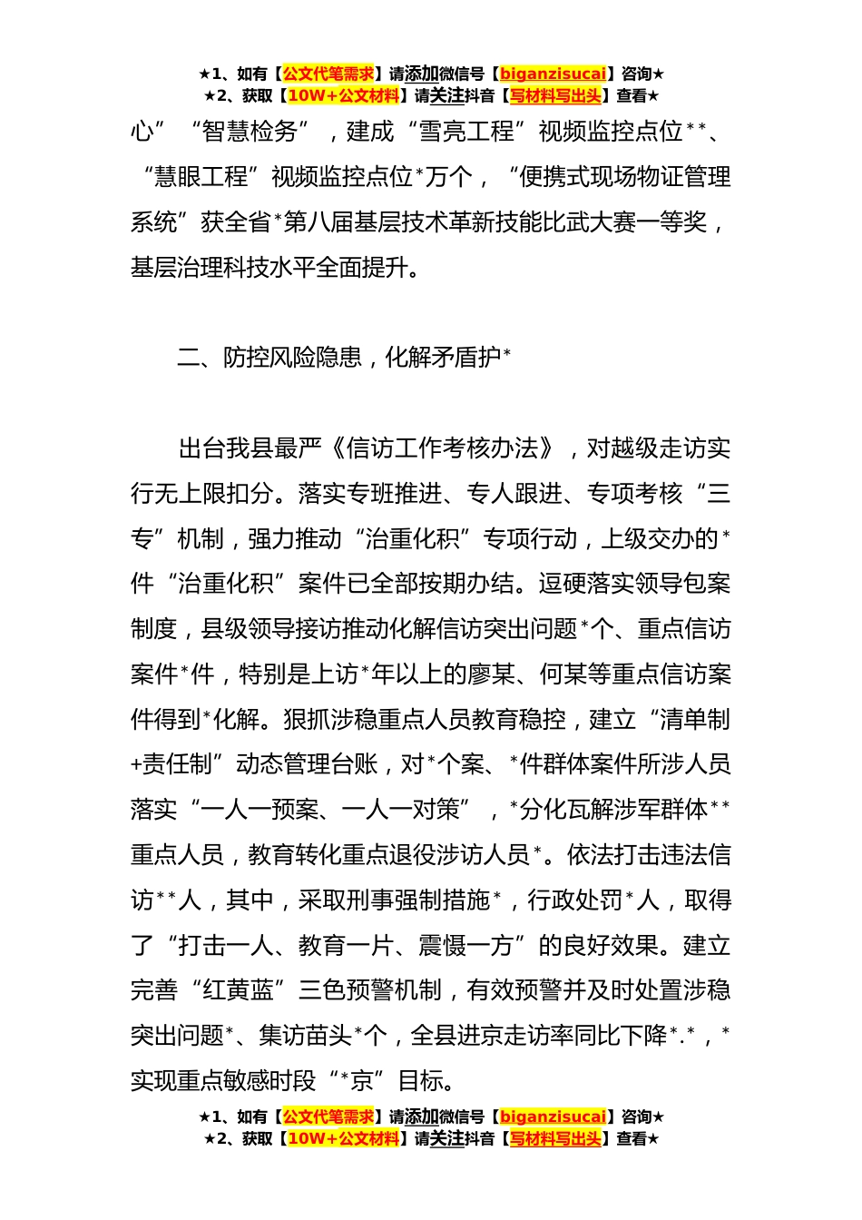 ★1、如有【公文代笔需求】请添加微信号【biganzisucai】咨询★★2、获取【10W+公文材料】请关注抖音【写材料写出头】查看★关于*建设先进集体事迹材料**年,**县坚持以习近平新时代中国特色社会主义思想为指导,深入贯彻落实中央、省委、市委关于*建设各项决策部署,取得了显著成效。两次荣获“维护社会稳定先进县”,全县电信网络诈骗发案数及案损数同比下降*.*%、*.*,负向排名降至全国*位、全省*,交通安全事故率同比下降6*,刑事案件数同比下降*.*%,连续*实现现行命案破案率**。人民群众幸福感、获得感和安全感持续提升。一、加强党的领导,上下联动抓*构建县委主要领导挂帅、分管县级领导具体负责、成员单位各司其职的*建设领导体系,召开县委常委会会议、县政府常务会议*,*建设领导小组会议*,专项工作推...