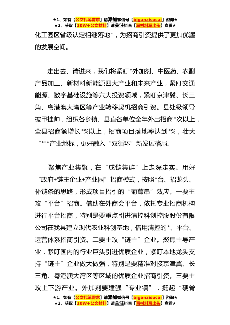★1、如有【公文代笔需求】请添加微信号【biganzisucai】咨询★★2、获取【10W+公文材料】请关注抖音【写材料写出头】查看★聚焦精准招商再掀招商热潮交流发言稿发展靠项目,项目靠招商。招商引资是经济工作的生命线和第一抓手。在全国各地招商引资“百舸争流、千帆竞发”的当下,能不能“勇挑大梁”,招商引资是重要战场。全市招商引资大会的召开,为今年招商引资拉开了帷幕,吹响了“集结号”发出了“动员令”。市委书记丁小强“等不起的责任感、慢不得的使命感、坐不住的紧迫感”的指示为我们鼓足了士气。市长储祥好“高扬战旗、充实‘弹药’、讲究战术、沸腾状态”的要求为我们指明了方向。我们将勇赴战场,锚定“走在前、开新局”,进一步增强“大招商、招大商,抓大项目、大抓项目”的使命感和责任感,在招...