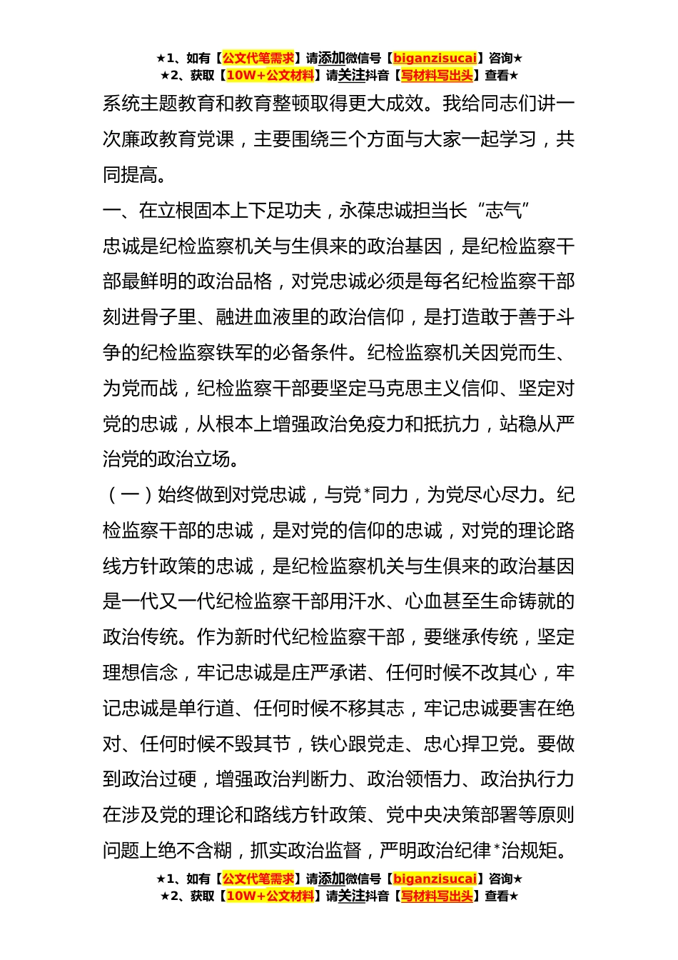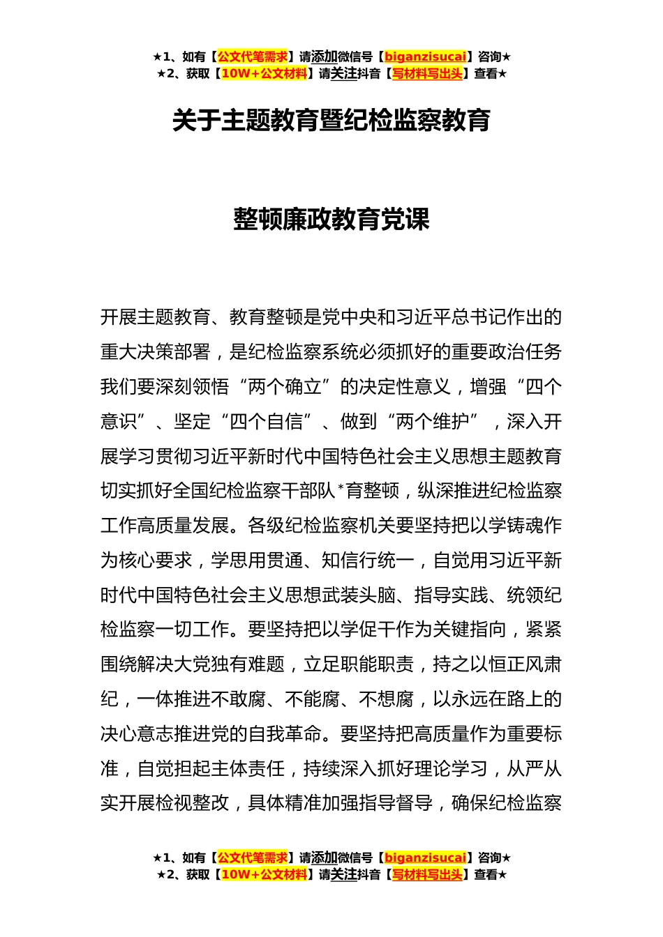 ★1、如有【公文代笔需求】请添加微信号【biganzisucai】咨询★★2、获取【10W+公文材料】请关注抖音【写材料写出头】查看★关于主题教育暨纪检监察教育整顿廉政教育党课开展主题教育、教育整顿是党中央和习近平总书记作出的重大决策部署,是纪检监察系统必须抓好的重要政治任务我们要深刻领悟“两个确立”的决定性意义,增强“四个意识”、坚定“四个自信”、做到“两个维护”,深入开展学习贯彻习近平新时代中国特色社会主义思想主题教育切实抓好全国纪检监察干部队*育整顿,纵深推进纪检监察工作高质量发展。各级纪检监察机关要坚持把以学铸魂作为核心要求,学思用贯通、知信行统一,自觉用习近平新时代中国特色社会主义思想武装头脑、指导实践、统领纪检监察一切工作。要坚持把以学促干作为关键指向,紧紧围绕...