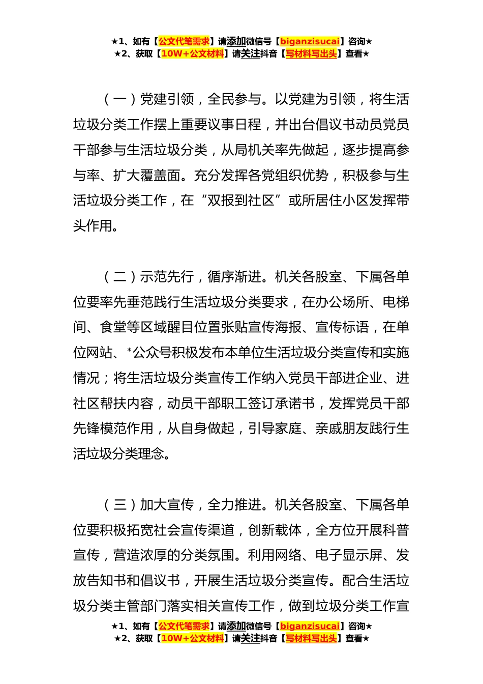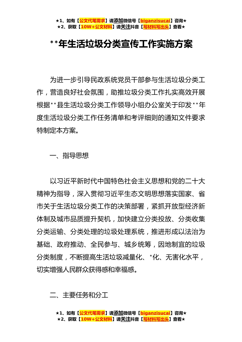 ★1、如有【公文代笔需求】请添加微信号【biganzisucai】咨询★★2、获取【10W+公文材料】请关注抖音【写材料写出头】查看★**年生活垃圾分类宣传工作实施方案为进一步引导民政系统党员干部参与生活垃圾分类工作,营造良好社会氛围,助推垃圾分类工作扎实高效开展根据**县生活垃圾分类工作领导小组办公室关于印发**年度生活垃圾分类工作任务清单和考评细则的通知文件要求特制定本方案。一、指导思想以习近平新时代中国特色社会主义思想和党的二十大精神为指导,深入贯彻习近平生态文明思想落实国家、省市关于生活垃圾分类工作的决策部署,紧抓开放型经济新体制及城市品质提升契机,加快建立分类投放、分类收集分类运输、分类处理的垃圾处理系统,推进形成以法治为基础、政府推动、全民参与、城乡统筹,因地制宜的...