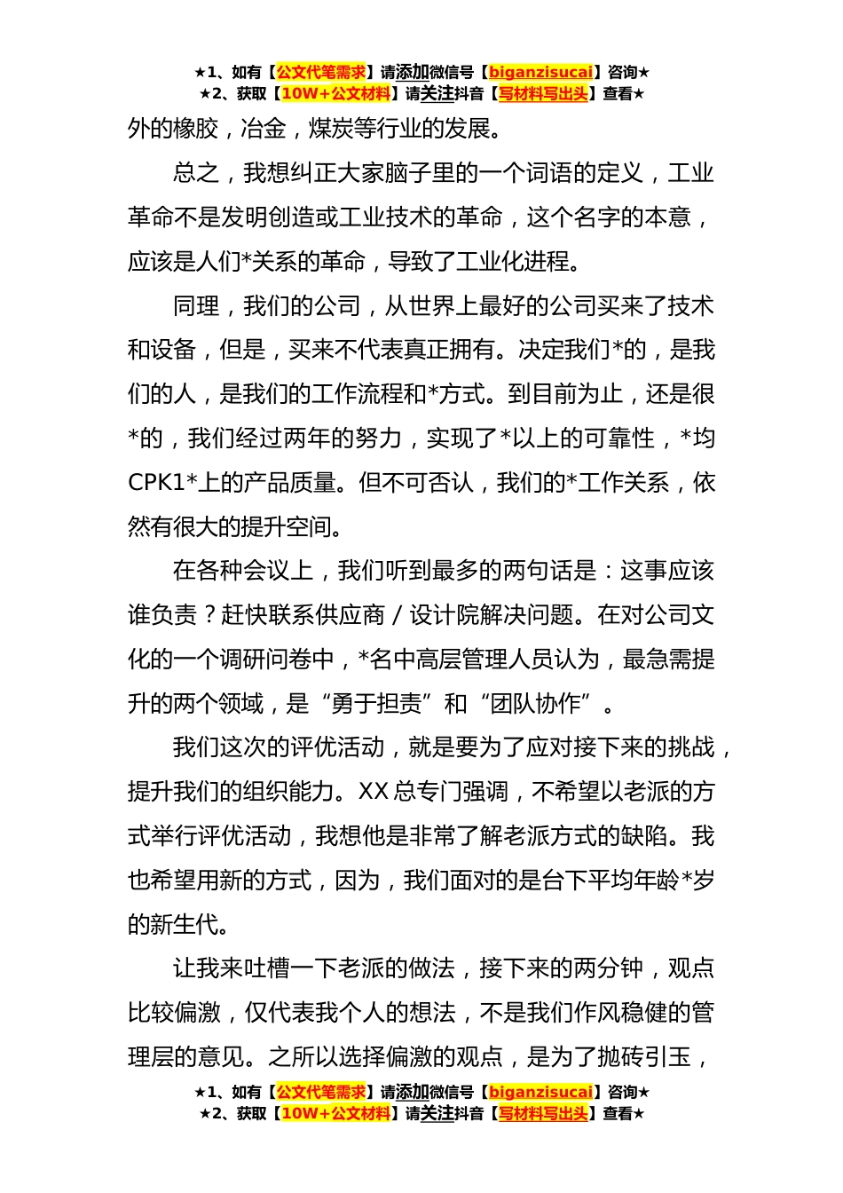 ★1、如有【公文代笔需求】请添加微信号【biganzisucai】咨询★★2、获取【10W+公文材料】请关注抖音【写材料写出头】查看★XX同志在年度先进表彰大会上的讲话今天是合资企业成立两年多,第一次正式的庆祝活动,第一次先进表彰活动。在XX总的直接领导下,我们设计了这样一个非常规的评优活动,我仅代表管理层,和大家谈三件事:第一,这次评优活动的意义,我们的设计初衷。第二,简单回顾一下评优的过程,解释一下我们评选的原则。最后,也提一些要求吧。先谈一个别的话题。大家都知道发生在英国的工业革命,是以**瓦特发明蒸汽机为标志的。大家知道第一个蒸汽机是什么时候发明的?**年和**分别有两个人独立制作出了工业蒸汽机,**年,也就是瓦特之前**,有两个科学家分别作出了蒸汽机模型。而人类历史上第一个蒸...