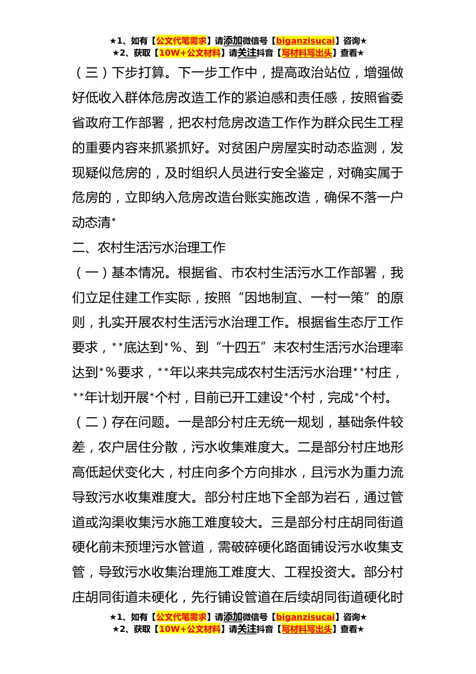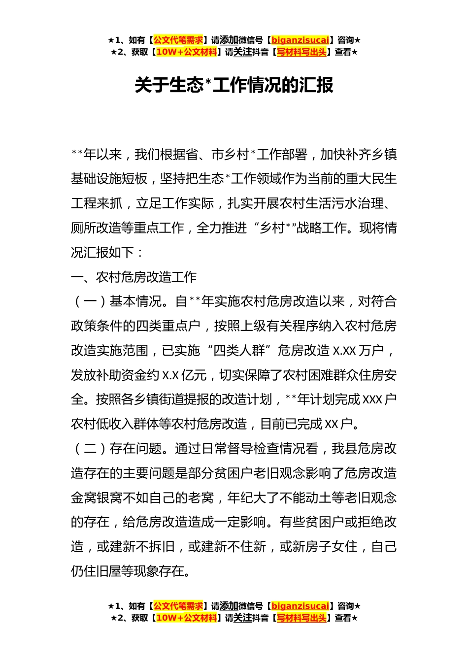 ★1、如有【公文代笔需求】请添加微信号【biganzisucai】咨询★★2、获取【10W+公文材料】请关注抖音【写材料写出头】查看★关于生态*工作情况的汇报**年以来,我们根据省、市乡村*工作部署,加快补齐乡镇基础设施短板,坚持把生态*工作领域作为当前的重大民生工程来抓,立足工作实际,扎实开展农村生活污水治理、厕所改造等重点工作,全力推进“乡村*”战略工作。现将情况汇报如下:一、农村危房改造工作(一)基本情况。自**年实施农村危房改造以来,对符合政策条件的四类重点户,按照上级有关程序纳入农村危房改造实施范围,已实施“四类人群”危房改造X.XX万户,发放补助资金约X.X亿元,切实保障了农村困难群众住房安全。按照各乡镇街道提报的改造计划,**年计划完成XXX户农村低收入群体等农村危房改造,目前...