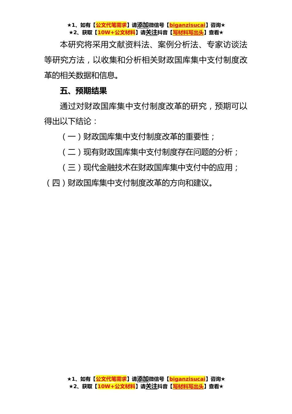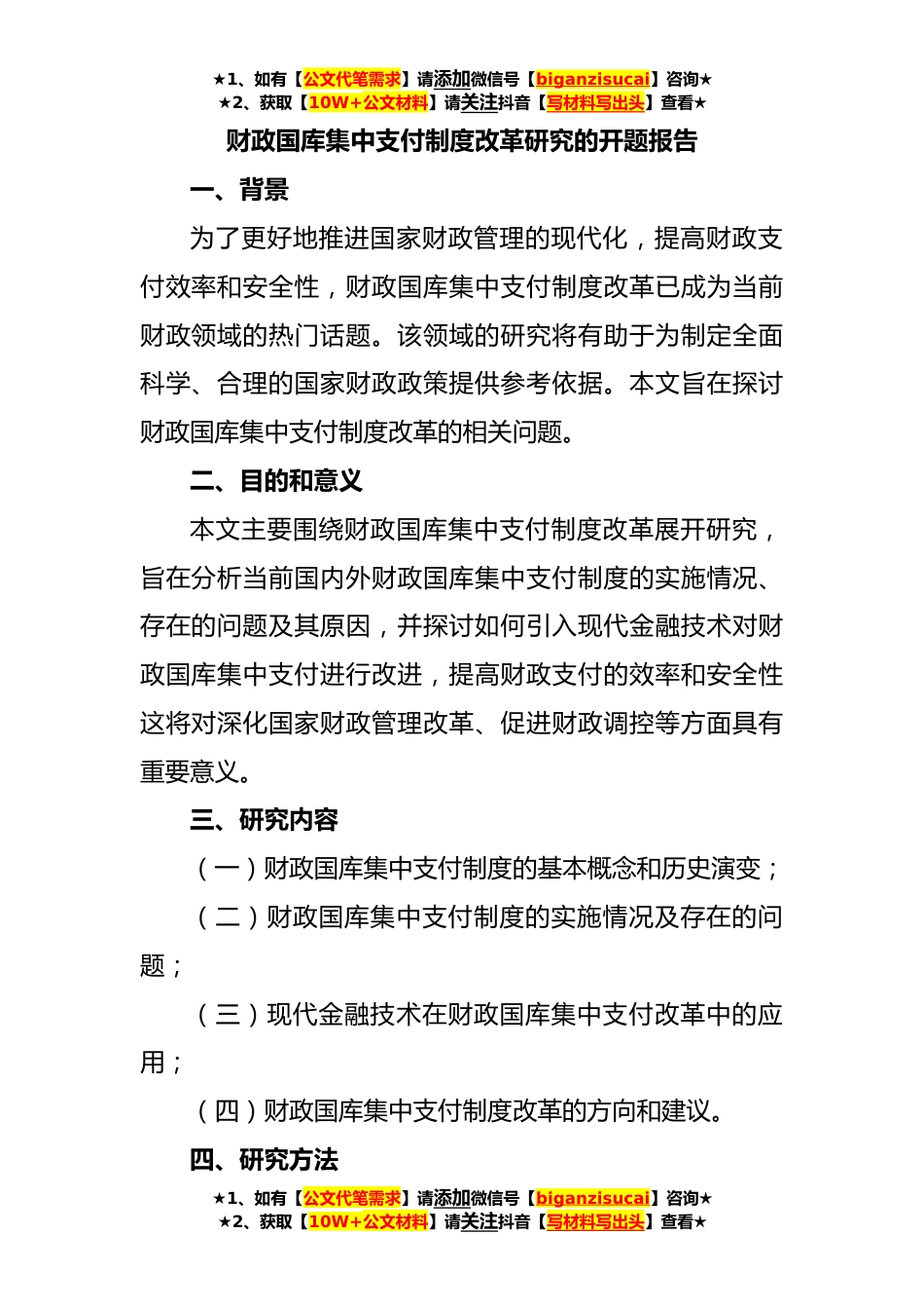 ★1、如有【公文代笔需求】请添加微信号【biganzisucai】咨询★★2、获取【10W+公文材料】请关注抖音【写材料写出头】查看★财政国库集中支付制度改革研究的开题报告一、背景为了更好地推进国家财政管理的现代化,提高财政支付效率和安全性,财政国库集中支付制度改革已成为当前财政领域的热门话题。该领域的研究将有助于为制定全面科学、合理的国家财政政策提供参考依据。本文旨在探讨财政国库集中支付制度改革的相关问题。二、目的和意义本文主要围绕财政国库集中支付制度改革展开研究,旨在分析当前国内外财政国库集中支付制度的实施情况、存在的问题及其原因,并探讨如何引入现代金融技术对财政国库集中支付进行改进,提高财政支付的效率和安全性这将对深化国家财政管理改革、促进财政调控等方面具有重要意义...