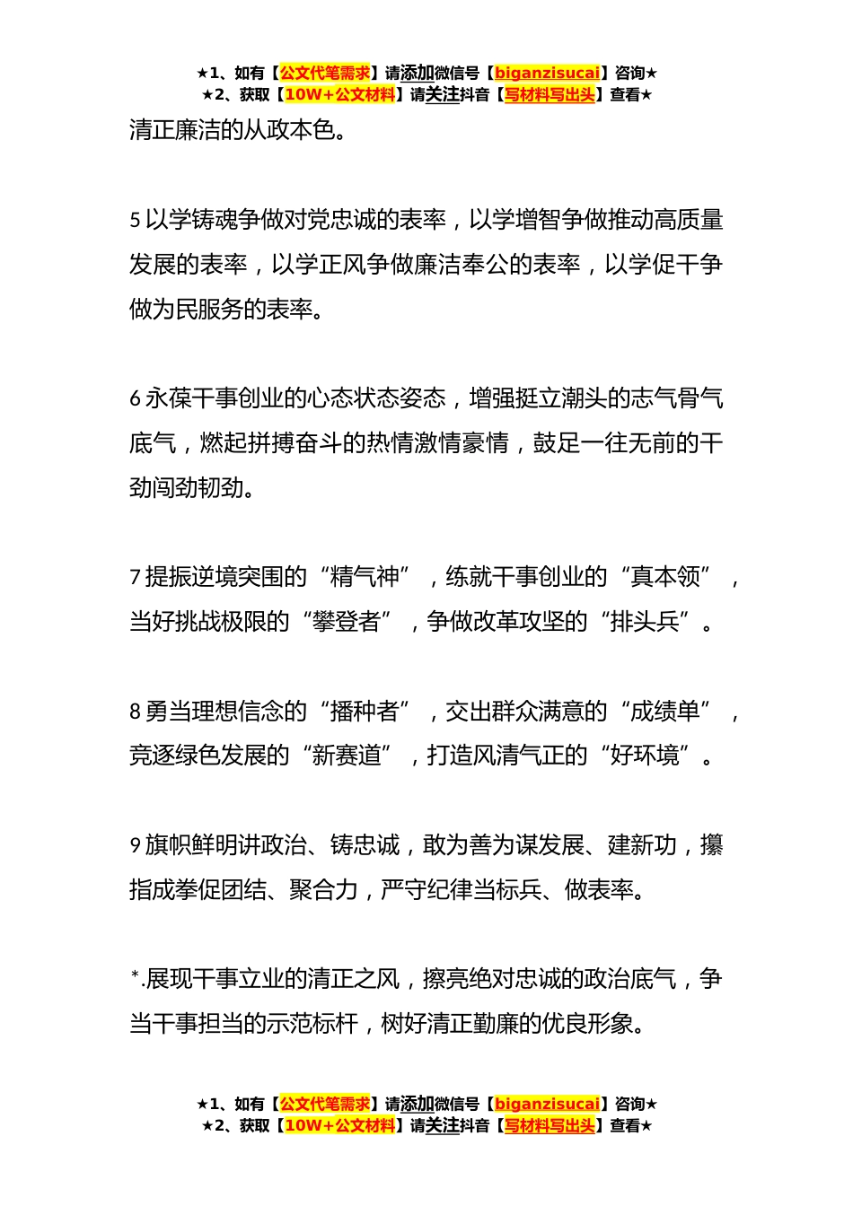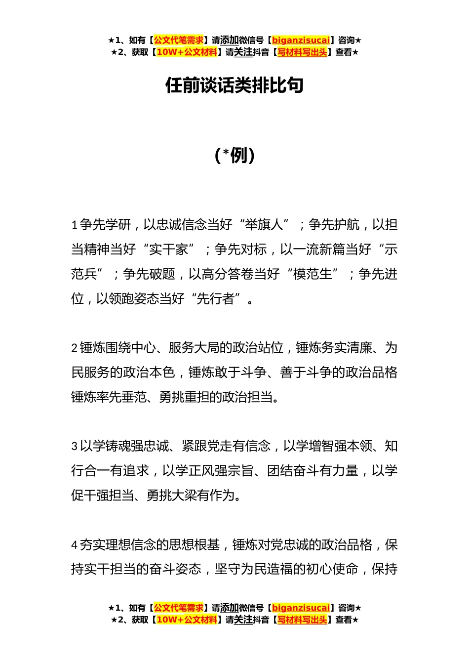 ★1、如有【公文代笔需求】请添加微信号【biganzisucai】咨询★★2、获取【10W+公文材料】请关注抖音【写材料写出头】查看★任前谈话类排比句(*例)1争先学研,以忠诚信念当好“举旗人”;争先护航,以担当精神当好“实干家”;争先对标,以一流新篇当好“示范兵”;争先破题,以高分答卷当好“模范生”;争先进位,以领跑姿态当好“先行者”。2锤炼围绕中心、服务大局的政治站位,锤炼务实清廉、为民服务的政治本色,锤炼敢于斗争、善于斗争的政治品格锤炼率先垂范、勇挑重担的政治担当。3以学铸魂强忠诚、紧跟党走有信念,以学增智强本领、知行合一有追求,以学正风强宗旨、团结奋斗有力量,以学促干强担当、勇挑大梁有作为。4夯实理想信念的思想根基,锤炼对党忠诚的政治品格,保持实干担当的奋斗姿态,坚守为...