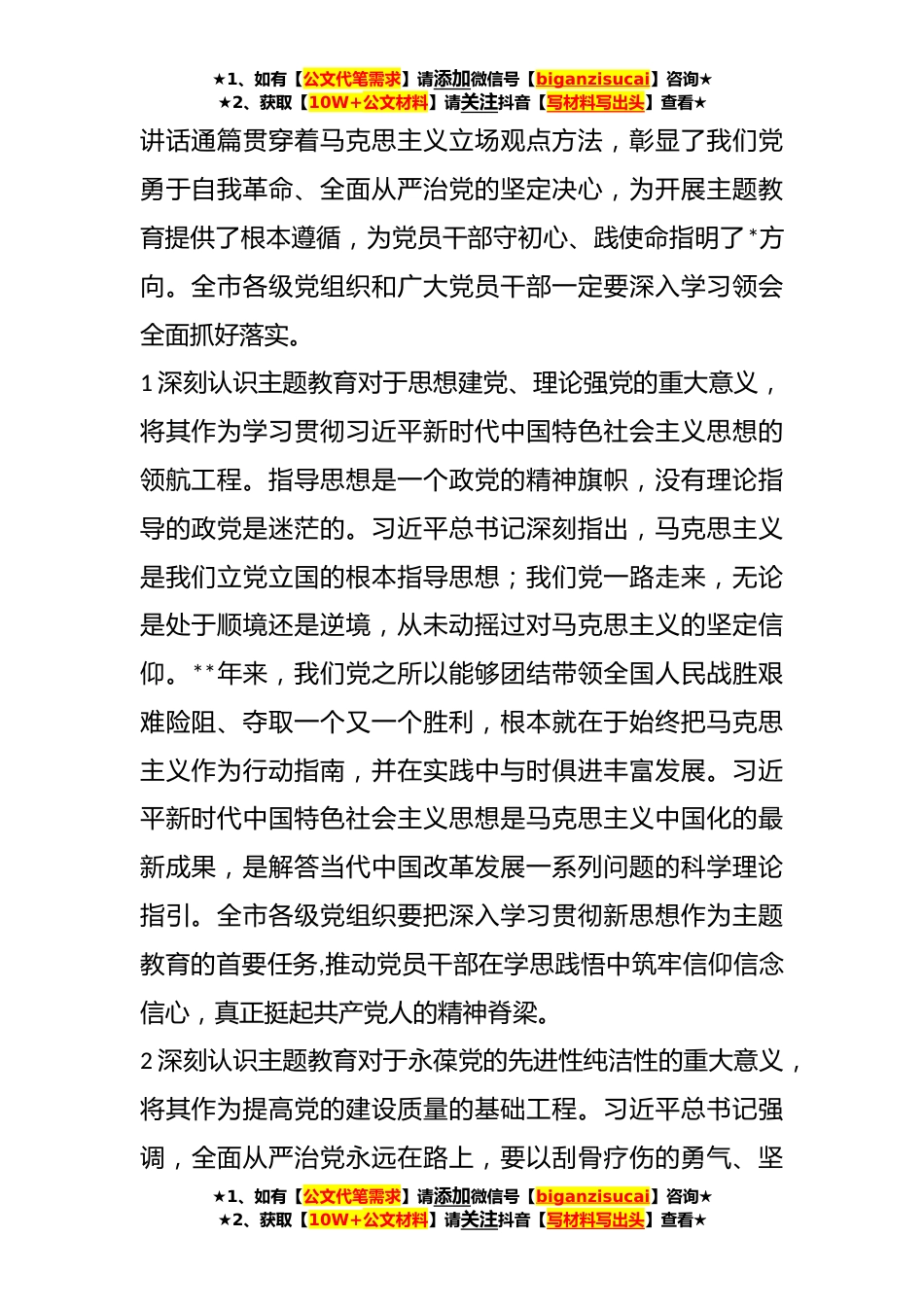 ★1、如有【公文代笔需求】请添加微信号【biganzisucai】咨询★★2、获取【10W+公文材料】请关注抖音【写材料写出头】查看★**年度在主题教育工作会议上的讲话汇编同志们:这次会议的主要任务是,以习近平新时代中国特色社会主义思想为指导,深入学习贯彻习近平总书记在中央学习贯彻习近平新时代中国特色社会主义思想主题教育工作会议上的重要讲话精神,对全市开展主题教育进行动员部署。根据市委常委会会议讨论精神,我讲四点意见。一、深入学习贯彻习近平总书记重要讲话精神,深刻领会开展主题教育的重大意义在全党开展学习贯彻习近平新时代中国特色社会主义思想主题教育,是以习近平同志为核心的党中央统揽伟大斗争伟大工程、伟大事业、伟大梦想作出的重大部署。**,中央召开主题教育工作会议,习近平总书记发...