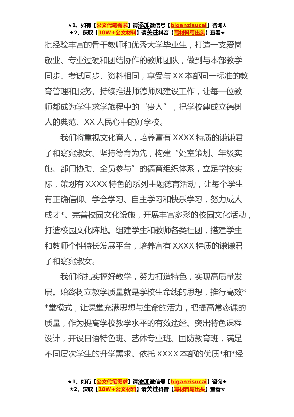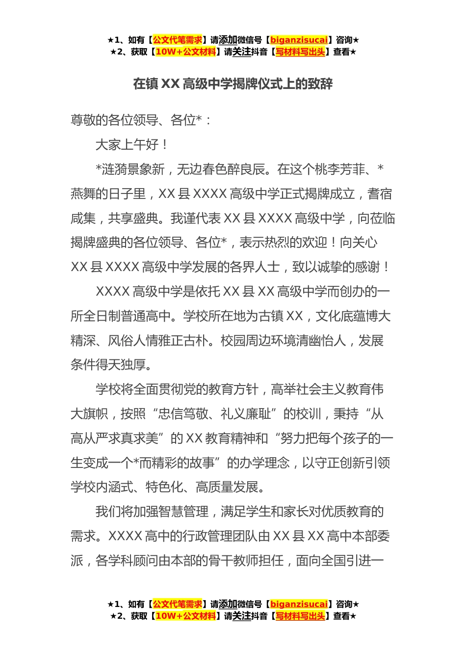 ★1、如有【公文代笔需求】请添加微信号【biganzisucai】咨询★★2、获取【10W+公文材料】请关注抖音【写材料写出头】查看★在镇XX高级中学揭牌仪式上的致辞尊敬的各位领导、各位*:大家上午好!*涟漪景象新,无边春色醉良辰。在这个桃李芳菲、*燕舞的日子里,XX县XXXX高级中学正式揭牌成立,耆宿咸集,共享盛典。我谨代表XX县XXXX高级中学,向莅临揭牌盛典的各位领导、各位*,表示热烈的欢迎!向关心XX县XXXX高级中学发展的各界人士,致以诚挚的感谢!XXXX高级中学是依托XX县XX高级中学而创办的一所全日制普通高中。学校所在地为古镇XX,文化底蕴博大精深、风俗人情雅正古朴。校园周边环境清幽怡人,发展条件得天独厚。学校将全面贯彻党的教育方针,高举社会主义教育伟大旗帜,按照“忠信笃敬、礼义廉耻”的校训...