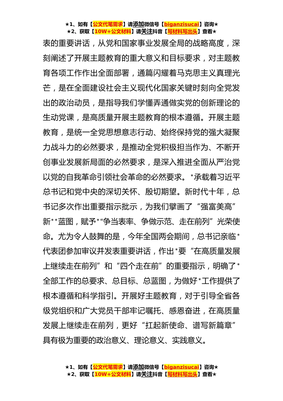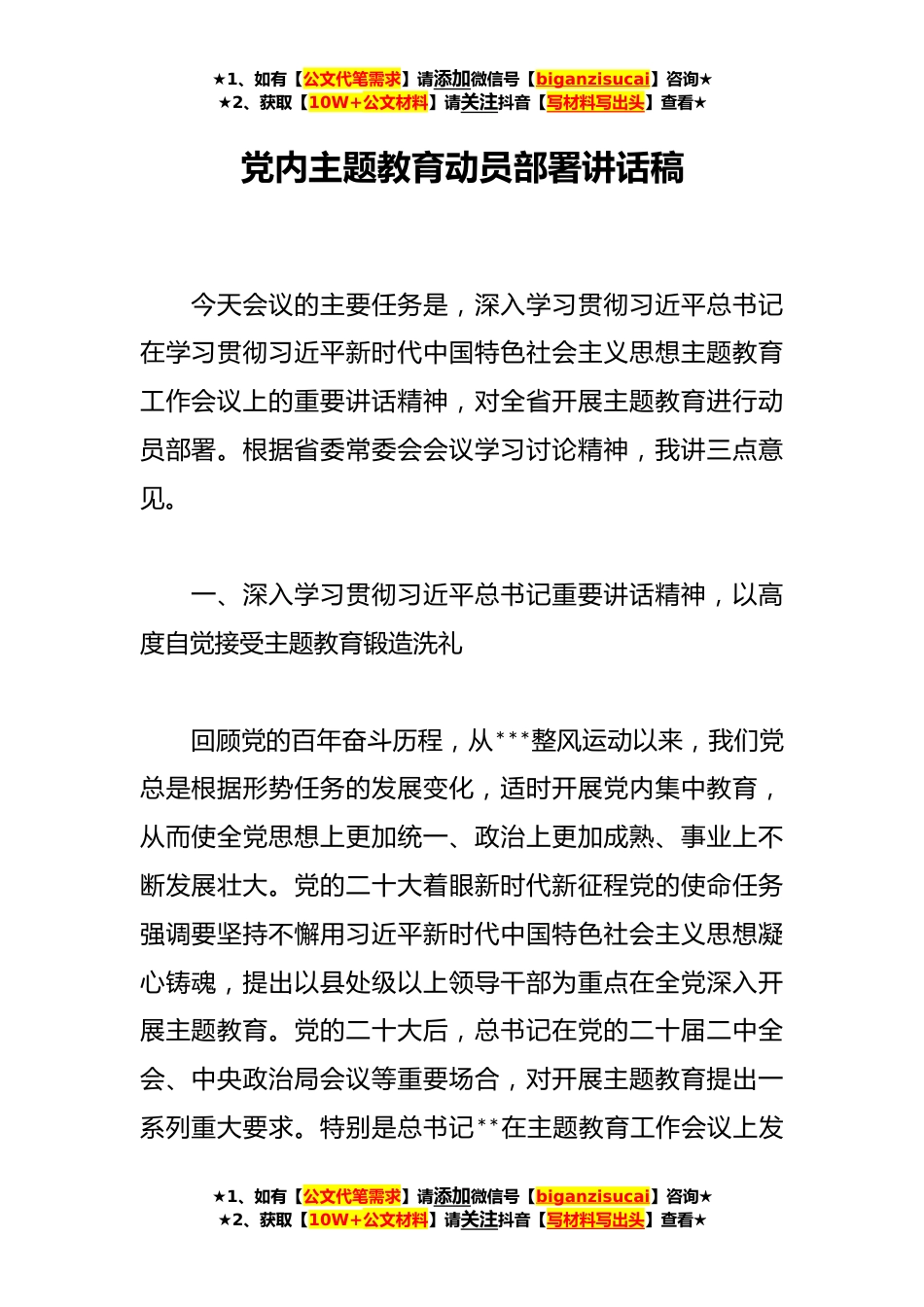 ★1、如有【公文代笔需求】请添加微信号【biganzisucai】咨询★★2、获取【10W+公文材料】请关注抖音【写材料写出头】查看★党内主题教育动员部署讲话稿今天会议的主要任务是,深入学习贯彻习近平总书记在学习贯彻习近平新时代中国特色社会主义思想主题教育工作会议上的重要讲话精神,对全省开展主题教育进行动员部署。根据省委常委会会议学习讨论精神,我讲三点意见。一、深入学习贯彻习近平总书记重要讲话精神,以高度自觉接受主题教育锻造洗礼回顾党的百年奋斗历程,从***整风运动以来,我们党总是根据形势任务的发展变化,适时开展党内集中教育,从而使全党思想上更加统一、政治上更加成熟、事业上不断发展壮大。党的二十大着眼新时代新征程党的使命任务强调要坚持不懈用习近平新时代中国特色社会主义思想凝心...