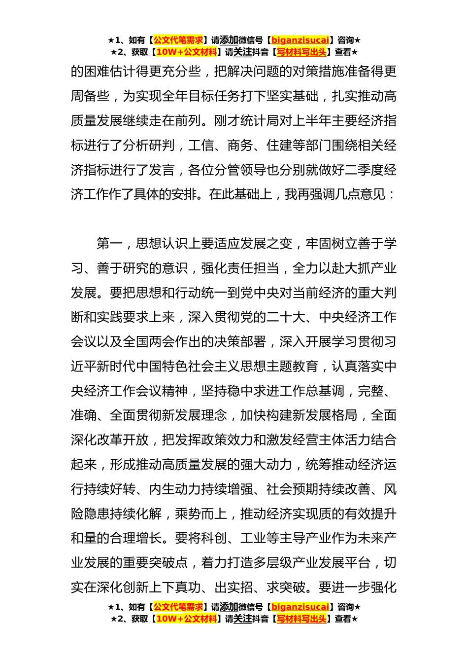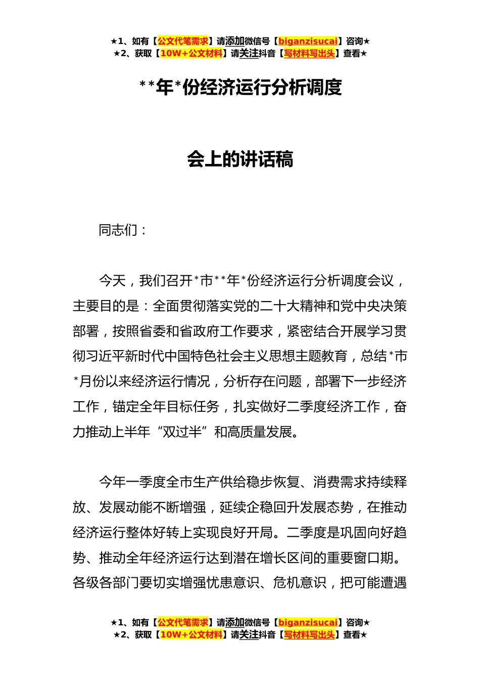 ★1、如有【公文代笔需求】请添加微信号【biganzisucai】咨询★★2、获取【10W+公文材料】请关注抖音【写材料写出头】查看★**年*份经济运行分析调度会上的讲话稿同志们:今天,我们召开*市**年*份经济运行分析调度会议,主要目的是:全面贯彻落实党的二十大精神和党中央决策部署,按照省委和省政府工作要求,紧密结合开展学习贯彻习近平新时代中国特色社会主义思想主题教育,总结*市*月份以来经济运行情况,分析存在问题,部署下一步经济工作,锚定全年目标任务,扎实做好二季度经济工作,奋力推动上半年“双过半”和高质量发展。今年一季度全市生产供给稳步恢复、消费需求持续释放、发展动能不断增强,延续企稳回升发展态势,在推动经济运行整体好转上实现良好开局。二季度是巩固向好趋势、推动全年经济运行达到...