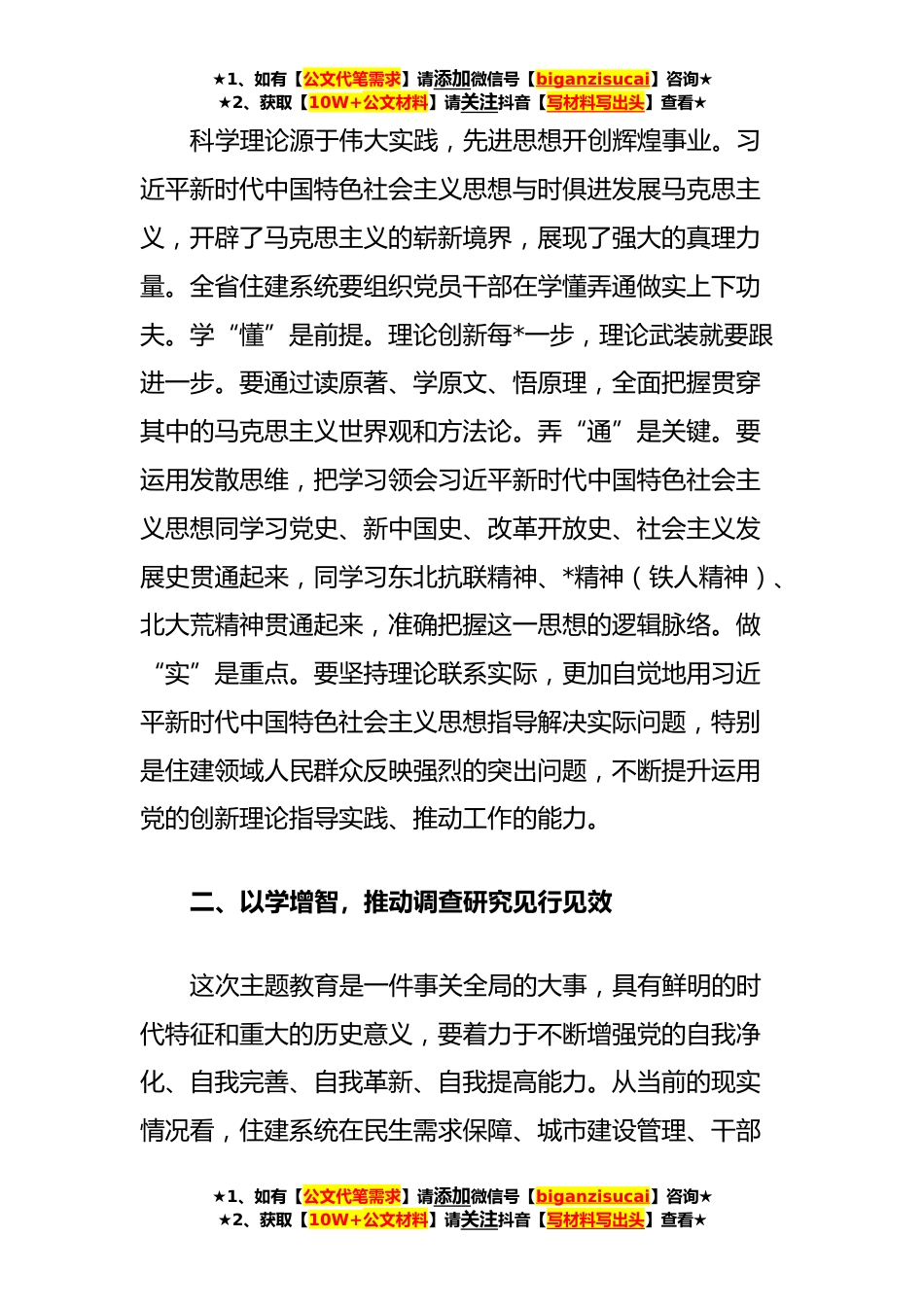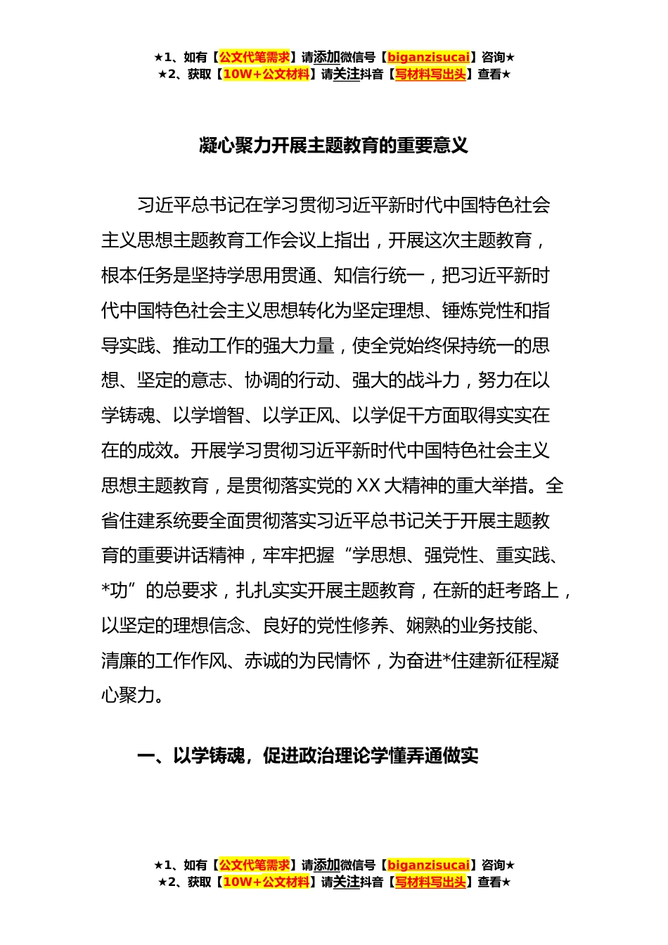 ★1、如有【公文代笔需求】请添加微信号【biganzisucai】咨询★★2、获取【10W+公文材料】请关注抖音【写材料写出头】查看★凝心聚力开展主题教育的重要意义习近平总书记在学习贯彻习近平新时代中国特色社会主义思想主题教育工作会议上指出,开展这次主题教育,根本任务是坚持学思用贯通、知信行统一,把习近平新时代中国特色社会主义思想转化为坚定理想、锤炼党性和指导实践、推动工作的强大力量,使全党始终保持统一的思想、坚定的意志、协调的行动、强大的战斗力,努力在以学铸魂、以学增智、以学正风、以学促干方面取得实实在在的成效。开展学习贯彻习近平新时代中国特色社会主义思想主题教育,是贯彻落实党的XX大精神的重大举措。全省住建系统要全面贯彻落实习近平总书记关于开展主题教育的重要讲话精神,牢...