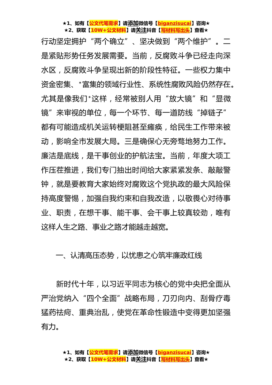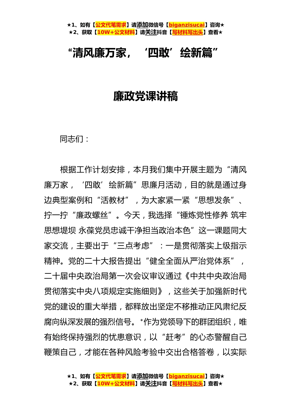 ★1、如有【公文代笔需求】请添加微信号【biganzisucai】咨询★★2、获取【10W+公文材料】请关注抖音【写材料写出头】查看★“清风廉万家,‘四敢’绘新篇”廉政党课讲稿同志们:根据工作计划安排,本月我们集中开展主题为“清风廉万家,‘四敢’绘新篇”思廉月活动,目的就是通过身边典型案例和“活教材”,为大家紧一紧“思想发条”、拧一拧“廉政螺丝”。今天,我选择“锤炼党性修养筑牢思想堤坝永葆党员忠诚干净担当政治本色”这一课题同大家交流,主要出于“三点考虑”:一是贯彻落实上级指示精神。党的二十大报告提出“健全全面从严治党体系”,二十届中央政治局第一次会议审议通过《中共中央政治局贯彻落实中央八项规定实施细则》,这些关于加强新时代党的建设的重大举措,都释放出坚定不移推动正风肃纪反...