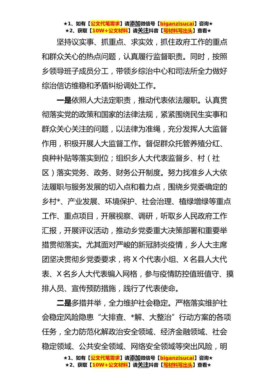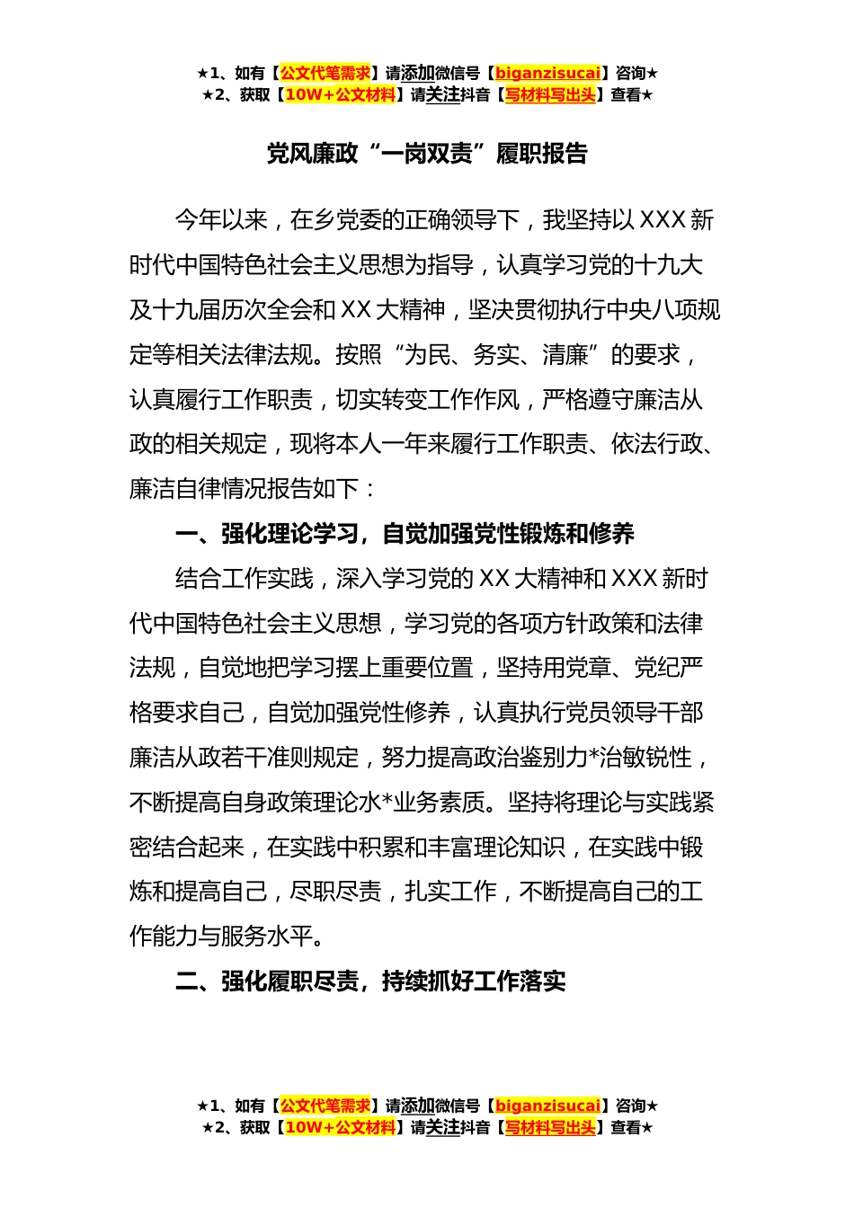 ★1、如有【公文代笔需求】请添加微信号【biganzisucai】咨询★★2、获取【10W+公文材料】请关注抖音【写材料写出头】查看★党风廉政“一岗双责”履职报告今年以来,在乡党委的正确领导下,我坚持以XXX新时代中国特色社会主义思想为指导,认真学习党的十九大及十九届历次全会和XX大精神,坚决贯彻执行中央八项规定等相关法律法规。按照“为民、务实、清廉”的要求,认真履行工作职责,切实转变工作作风,严格遵守廉洁从政的相关规定,现将本人一年来履行工作职责、依法行政、廉洁自律情况报告如下:一、强化理论学习,自觉加强党性锻炼和修养结合工作实践,深入学习党的XX大精神和XXX新时代中国特色社会主义思想,学习党的各项方针政策和法律法规,自觉地把学习摆上重要位置,坚持用党章、党纪严格要求自己,自觉...