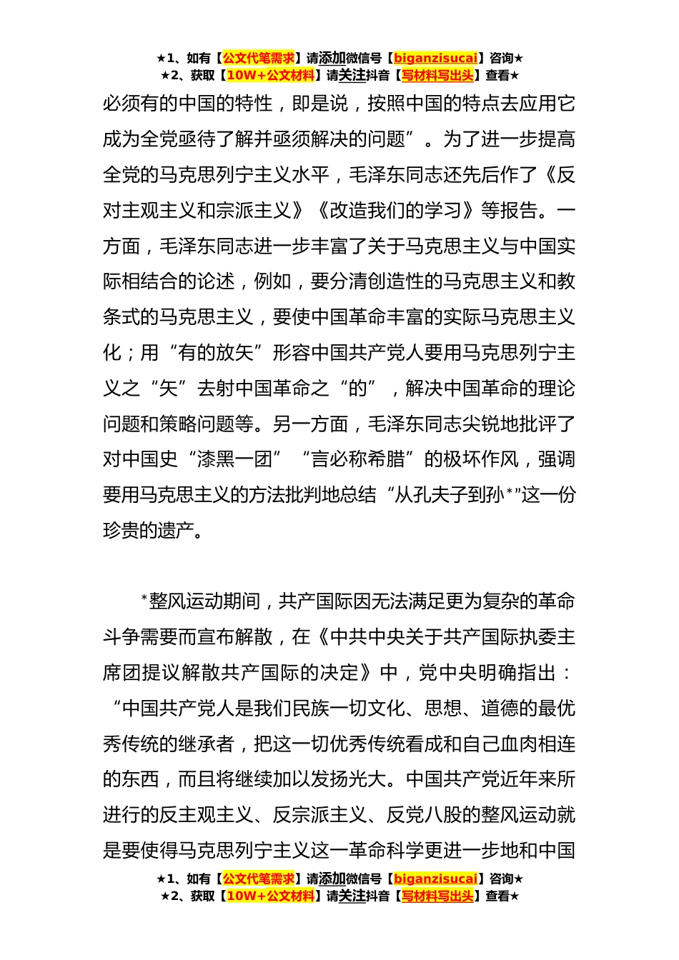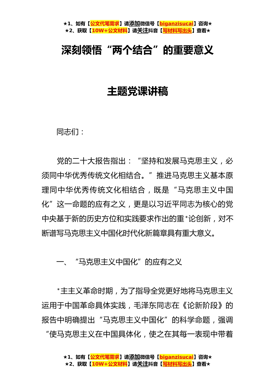 ★1、如有【公文代笔需求】请添加微信号【biganzisucai】咨询★★2、获取【10W+公文材料】请关注抖音【写材料写出头】查看★深刻领悟“两个结合”的重要意义主题党课讲稿同志们:党的二十大报告指出:“坚持和发展马克思主义,必须同中华优秀传统文化相结合。”推进马克思主义基本原理同中华优秀传统文化相结合,既是“马克思主义中国化”这一命题的应有之义,更是以习近平同志为核心的党中央基于新的历史方位和实践要求作出的重*论创新,对不断谱写马克思主义中国化时代化新篇章具有重大意义。一、“马克思主义中国化”的应有之义*主主义革命时期,为了指导全党更好地将马克思主义运用于中国革命具体实践,毛泽东同志在《论新阶段》的报告中明确提出“马克思主义中国化”的科学命题,强调“使马克思主义在中国具...
