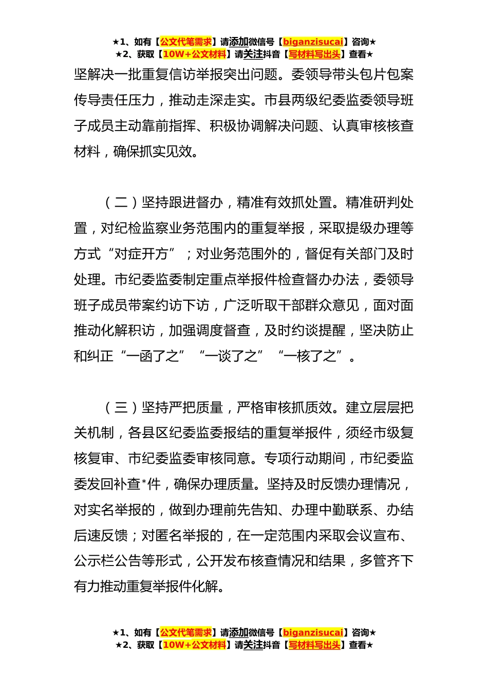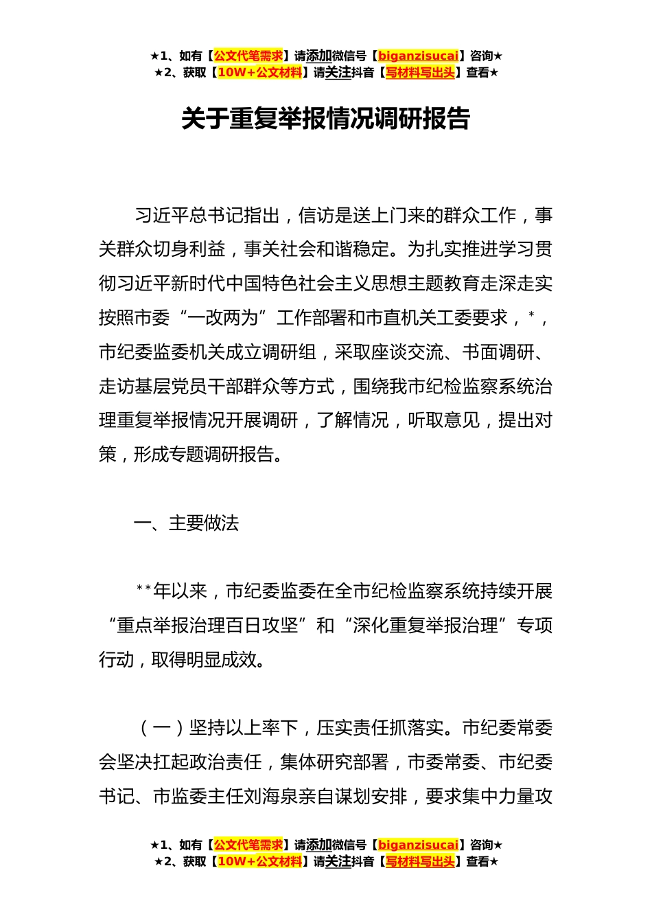 ★1、如有【公文代笔需求】请添加微信号【biganzisucai】咨询★★2、获取【10W+公文材料】请关注抖音【写材料写出头】查看★关于重复举报情况调研报告习近平总书记指出,信访是送上门来的群众工作,事关群众切身利益,事关社会和谐稳定。为扎实推进学习贯彻习近平新时代中国特色社会主义思想主题教育走深走实按照市委“一改两为”工作部署和市直机关工委要求,*,市纪委监委机关成立调研组,采取座谈交流、书面调研、走访基层党员干部群众等方式,围绕我市纪检监察系统治理重复举报情况开展调研,了解情况,听取意见,提出对策,形成专题调研报告。一、主要做法**年以来,市纪委监委在全市纪检监察系统持续开展“重点举报治理百日攻坚”和“深化重复举报治理”专项行动,取得明显成效。(一)坚持以上率下,压实责...