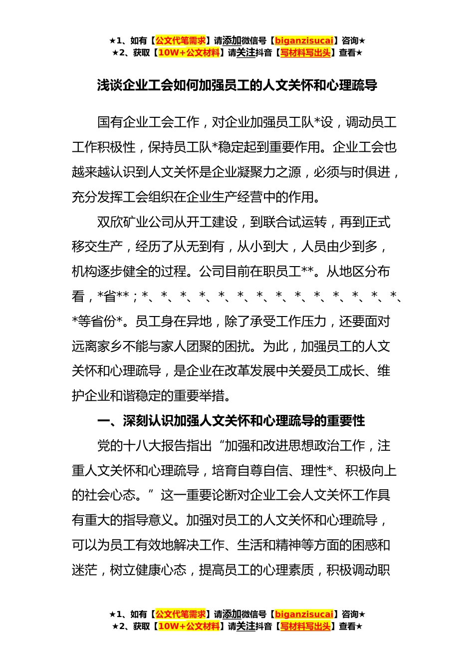 ★1、如有【公文代笔需求】请添加微信号【biganzisucai】咨询★★2、获取【10W+公文材料】请关注抖音【写材料写出头】查看★浅谈企业工会如何加强员工的人文关怀和心理疏导国有企业工会工作,对企业加强员工队*设,调动员工工作积极性,保持员工队*稳定起到重要作用。企业工会也越来越认识到人文关怀是企业凝聚力之源,必须与时俱进,充分发挥工会组织在企业生产经营中的作用。双欣矿业公司从开工建设,到联合试运转,再到正式移交生产,经历了从无到有,从小到大,人员由少到多,机构逐步健全的过程。公司目前在职员工**。从地区分布看,*省**;*、*、*、*、*、*、*、*、*、*、*、*、*、*、*等省份*。员工身在异地,除了承受工作压力,还要面对远离家乡不能与家人团聚的困扰。为此,加强员工的人文关怀和心理疏导...