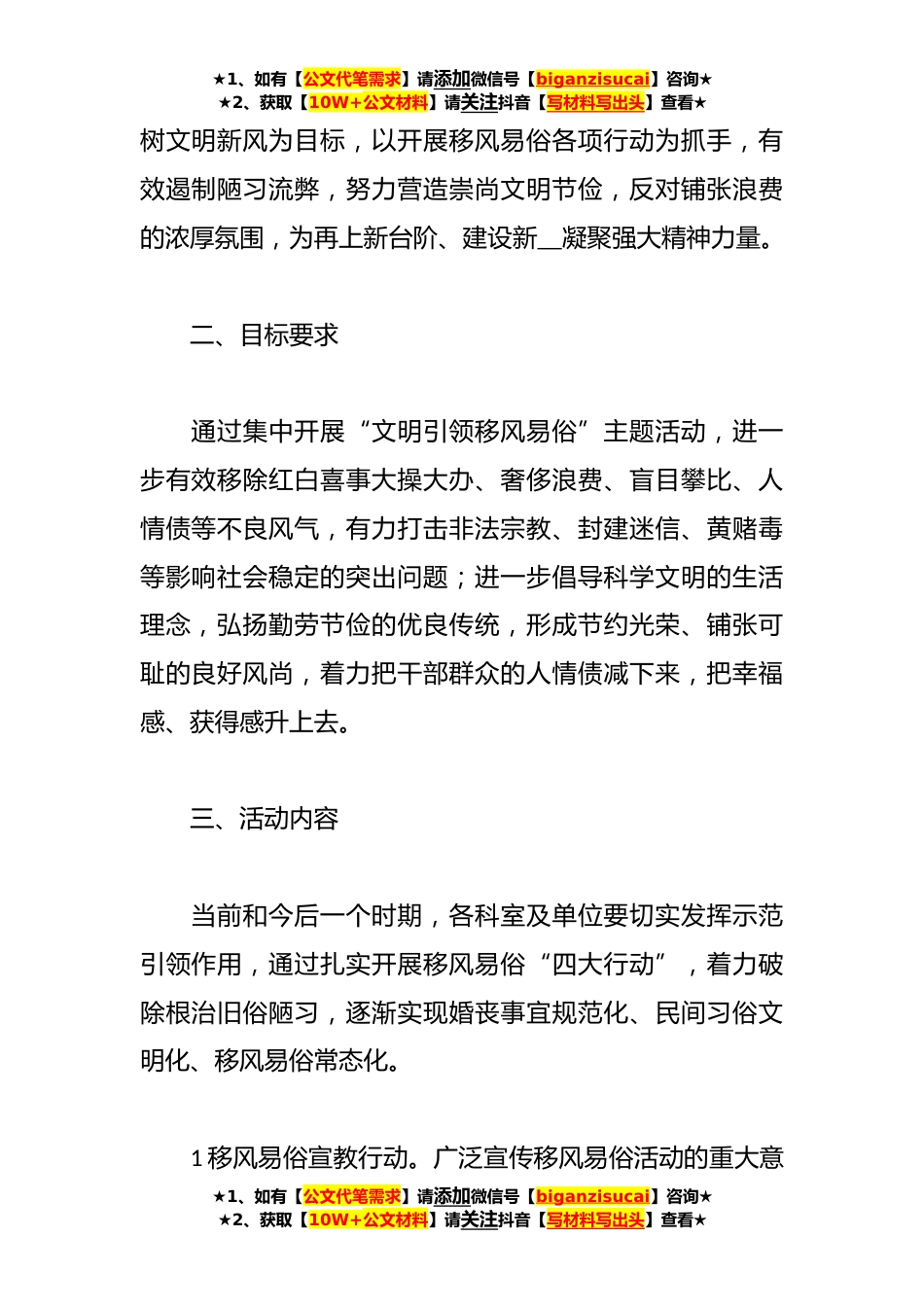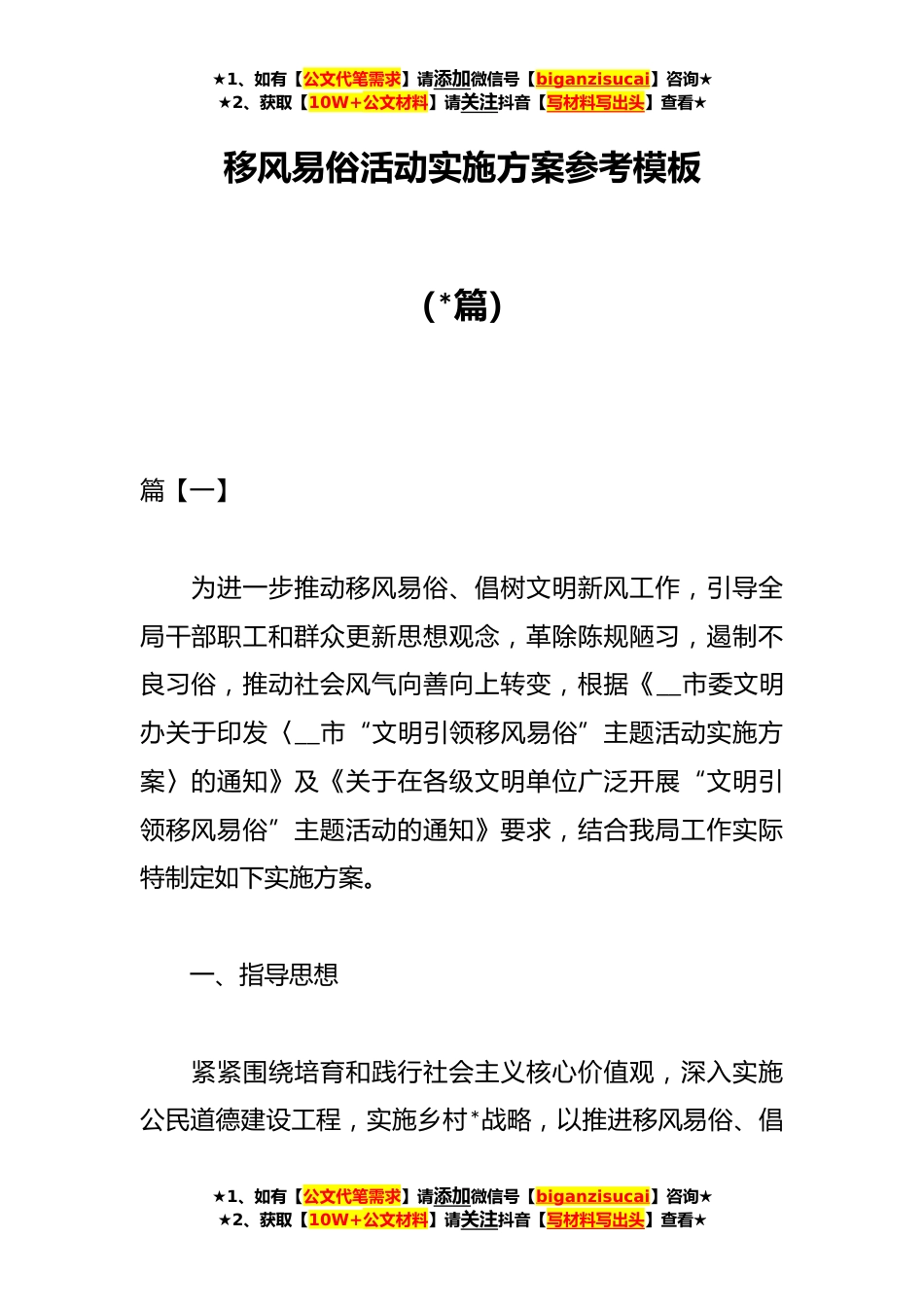 ★1、如有【公文代笔需求】请添加微信号【biganzisucai】咨询★★2、获取【10W+公文材料】请关注抖音【写材料写出头】查看★移风易俗活动实施方案参考模板(*篇)篇【一】为进一步推动移风易俗、倡树文明新风工作,引导全局干部职工和群众更新思想观念,革除陈规陋习,遏制不良习俗,推动社会风气向善向上转变,根据《__市委文明办关于印发〈__市“文明引领移风易俗”主题活动实施方案〉的通知》及《关于在各级文明单位广泛开展“文明引领移风易俗”主题活动的通知》要求,结合我局工作实际特制定如下实施方案。一、指导思想紧紧围绕培育和践行社会主义核心价值观,深入实施公民道德建设工程,实施乡村*战略,以推进移风易俗、倡★1、如有【公文代笔需求】请添加微信号【biganzisucai】咨询★★2、获取【10W+公文...