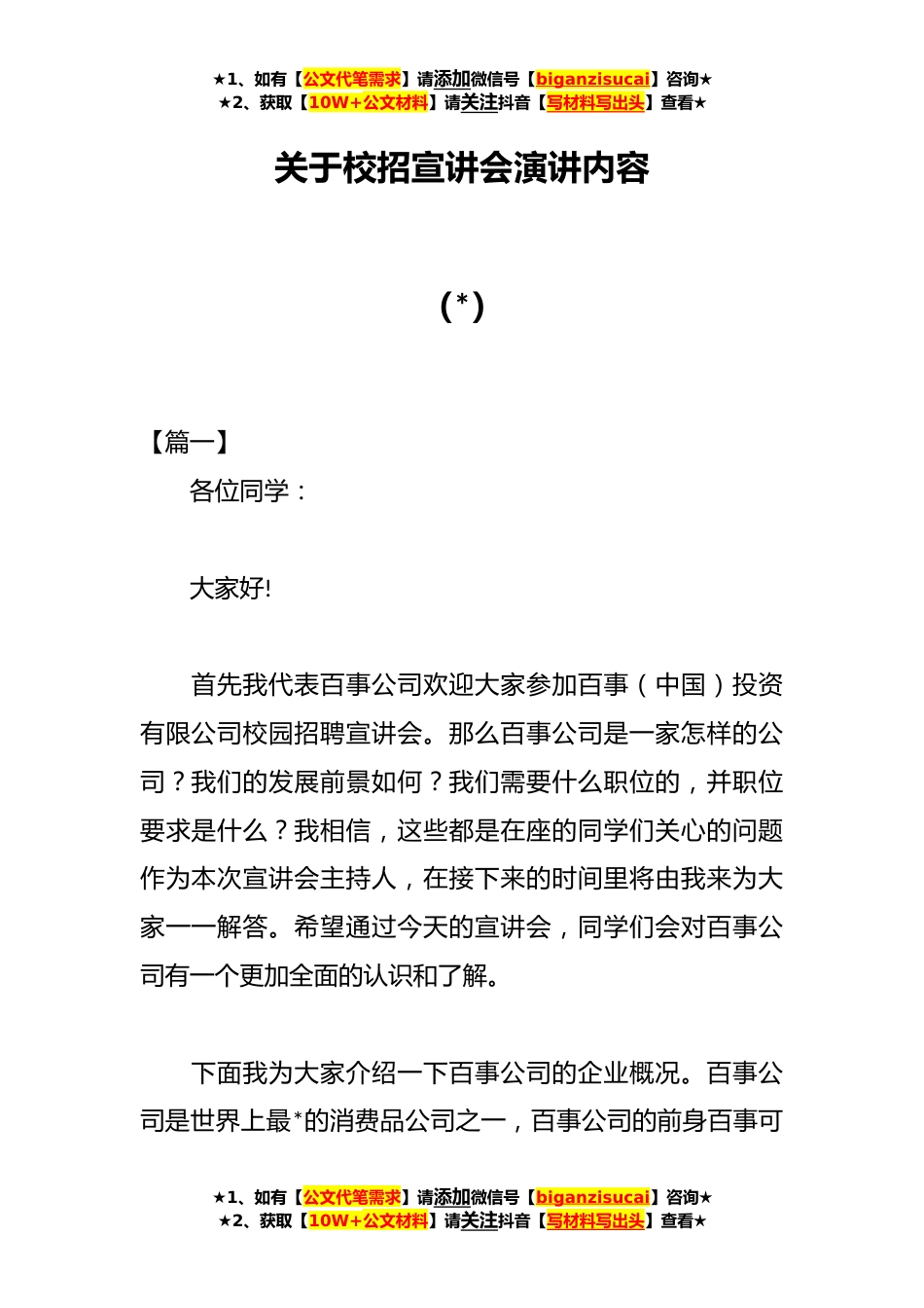 ★1、如有【公文代笔需求】请添加微信号【biganzisucai】咨询★★2、获取【10W+公文材料】请关注抖音【写材料写出头】查看★关于校招宣讲会演讲内容(*)【篇一】各位同学:大家好!首先我代表百事公司欢迎大家参加百事(中国)投资有限公司校园招聘宣讲会。那么百事公司是一家怎样的公司?我们的发展前景如何?我们需要什么职位的,并职位要求是什么?我相信,这些都是在座的同学们关心的问题作为本次宣讲会主持人,在接下来的时间里将由我来为大家一一解答。希望通过今天的宣讲会,同学们会对百事公司有一个更加全面的认识和了解。下面我为大家介绍一下百事公司的企业概况。百事公司是世界上最*的消费品公司之一,百事公司的前身百事可★1、如有【公文代笔需求】请添加微信号【biganzisucai】咨询★★2、获取【10...